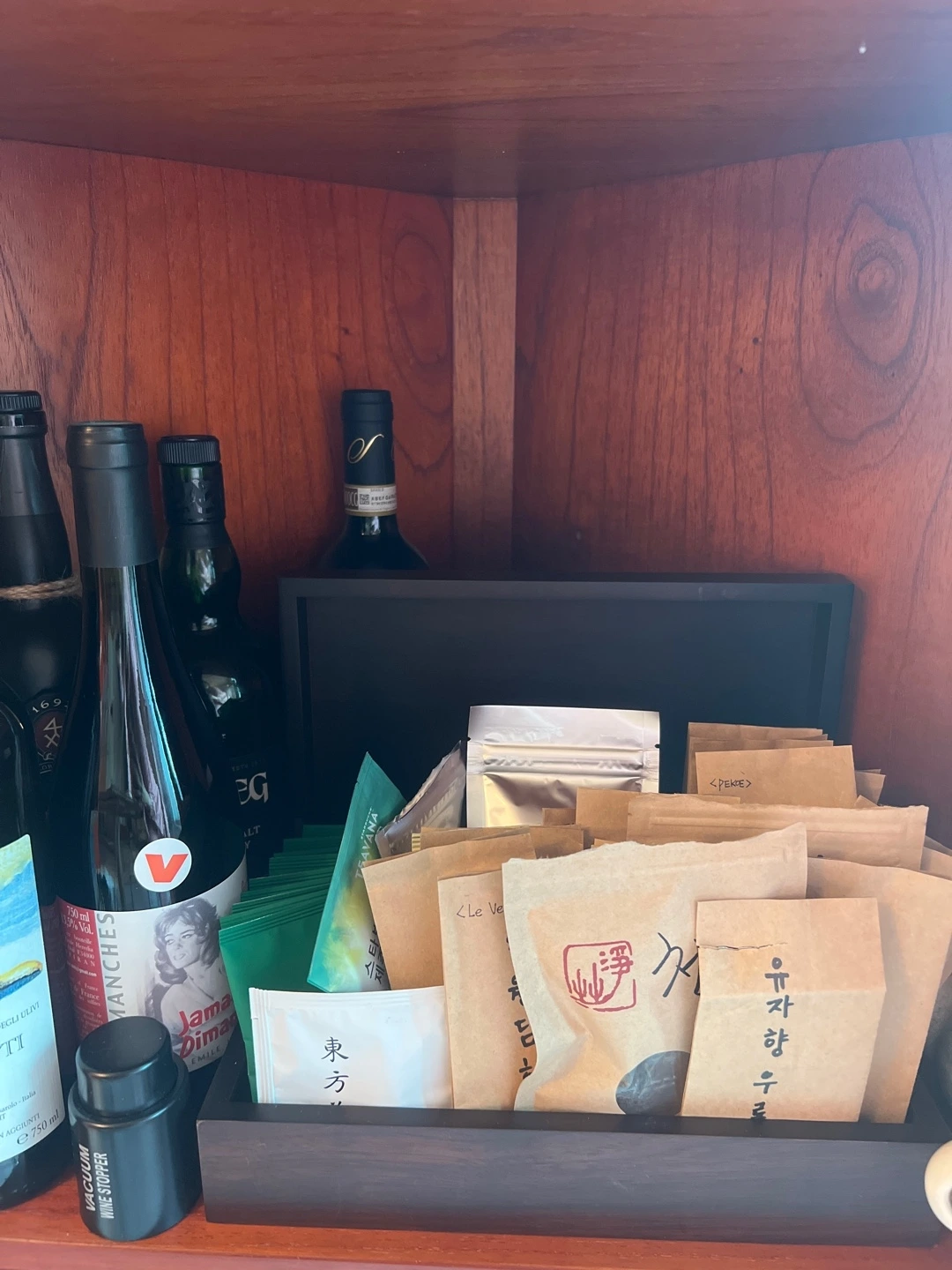 와인을 마시다 보면 와인잔이 종류별로 필요하고, 와인병을 막아놓을 진공 마개부터 샴페인이나 화이트 와인을 칠링 시킬 수 있는 칠러, 오프너와 에어레이터까지 다양한 소품을 갖추게 된다. 구매한 것도 있고, 선물 받은 것도 있다. 이런 와인과 관련된 모든 기물과 와인병들을 넣어놓던 거실 코너장에 이제 차와 다기를 들여놓기 시작했다. 와인이 있던 자리에 차가 비집고 들어가 공존하고 있는 코너장은 어쩌면 내 취미이자 욕망을 담는 공간인 것도 같다.