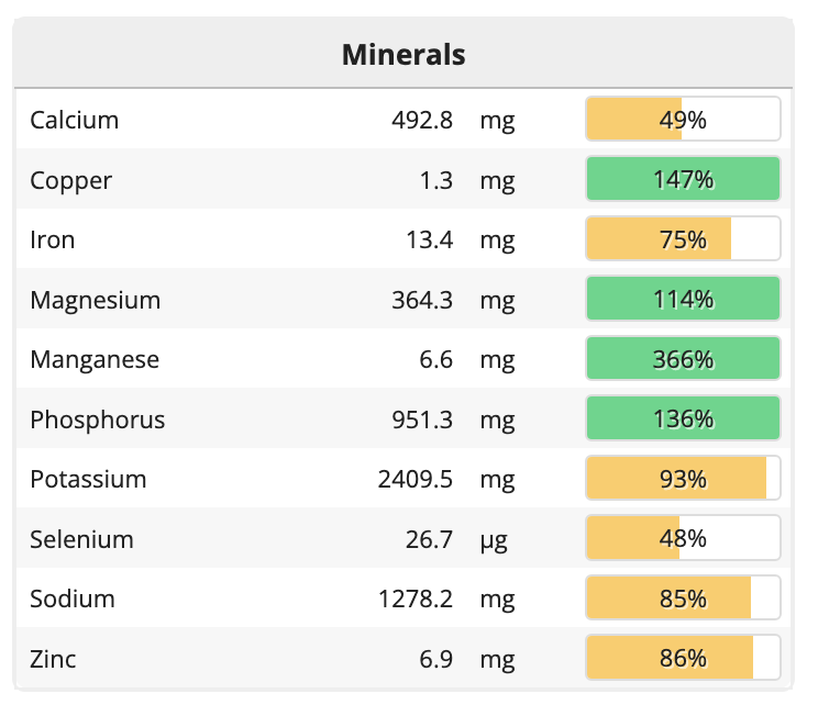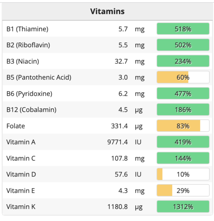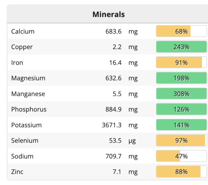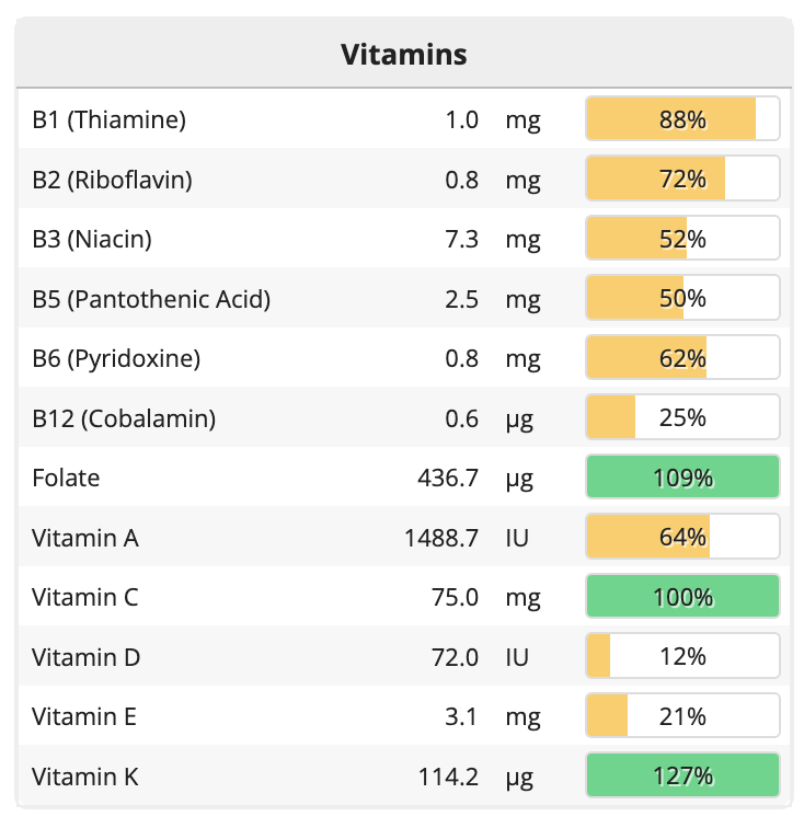 단백질은 충분히 섭취했고, 필수 아미노산을 모두 다양하게 잘 섭취한 것으로 나타났다. 대부분의 미네랄도 충분했고, 비타민은 몇 가지가 좀 부족했다. 비타민D는 점심을 먹으러 오가고, 사전투표를 하는 과정에서 햇볕을 충분히 쬐었기 때문에 문제가 없다. 비타민 B12는 오트 밀크 음료(오틀리)에 첨가된 것으로 조금 섭취했다. 매일 먹지 않아도 되는 영양소기 때문에 미량을 먹은 것으로 충분하다고 자평한다. 비타민E는 조금 부족했고, 마그네슘이 충분한 만큼 칼슘은 충분히 먹지 않았으므로 칼슘 섭취를 잘할 수 있는 방법도 고민해봐야겠다고 생각했다. 물론 정확한 분석은 내가 먹은 식사를 실험실로 보내 분석하는 것일 테고 이 사이트의 분석은 대략적인 것이겠지만, 그래도 무엇이 부족한지는 비슷하게나마 가늠해볼 수 있다고 본다.