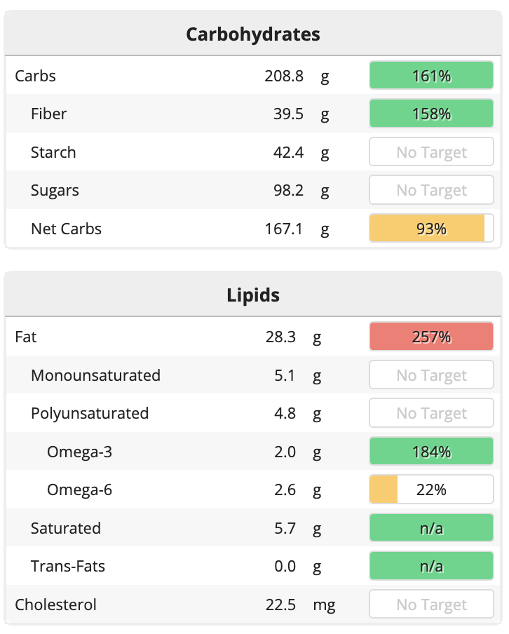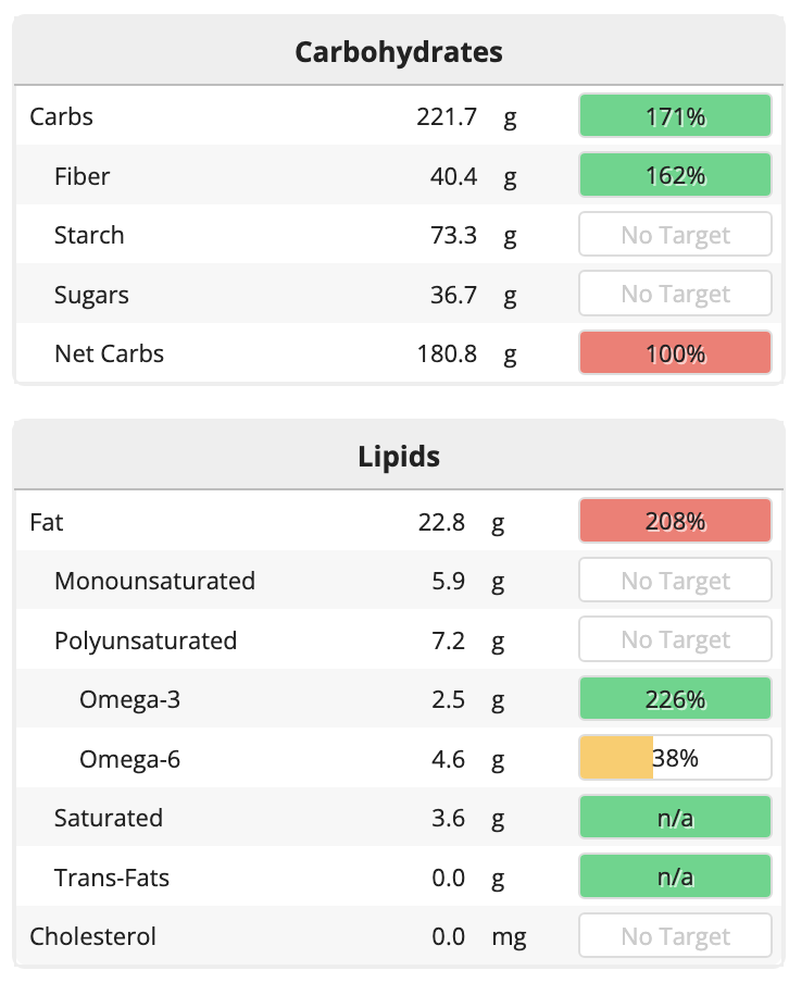 몹시 흥미로웠다. 첫째로 삼시 세 끼와 간식까지 모두 기름을 먹지 않았는데도 지방의 양은 넘치게 섭취했다. 아침으로 먹은 오버나잇 오트밀에 견과류와 플렉씨드, 치아시드, 헴프 시드를 더한 것에서 지방을 많이 섭취했고, 콩에도 지방이 들어있어서 더해졌다. 다만 오메가 3가를 충분히 차고 넘칠 만큼 섭취해서 오메가 3와 오메가 6의 비율이 1:2도 되지 않은 정도이니, 이 정도면 나쁘지 않다고 생각한다.