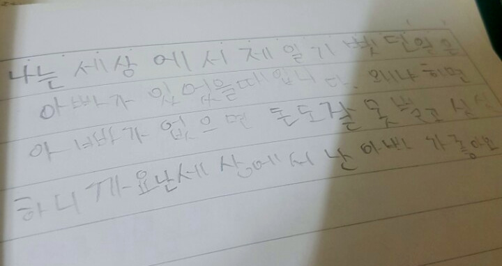 엄마는 어떻게 받아들이고 믿어왔을까? 사망 이후 의지할 곳이 없는 엄마는 일기장에 연모와 절망과 같은 평생 가슴을 후벼 파는 짐덩어리들을 글로 옮겨놓았다. 지금은 일기장이 다 뜯겨서 어디 갔는지 모르겠지만 내가 어렸을 때 어렴풋이 읽었던 내용은 그러한 것들이었다. 엄마는 기록하는 것을 좋아했다. 몇 년 치 가계부에는 장을 본 목록과 어디를 갔고 무엇을 먹었는지 그리고 그때 어떤 기분이었는지 모두 기록되어 있었다. 하지만 2003년부터는 그런 기록들이 남아있지 않았다. 마지막 남은 알량한 자존심으로는 나와 형을 계속 다니고 있었던 값비싼 사교육시설에서 졸업을 시키는 것이었다. 내가 공부하던 책상 서랍에는 그곳에서 적은 어릴적에 가장 슬프고 기뻤던 일들을 적어놓은 글이 남아있었다.