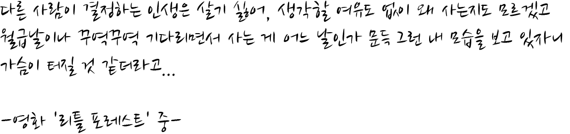 도시를 떠올리면 '24시간 편리한 딜러 버리 서비스' , '다양한 볼거리' , '추가 배송 요금 X' , '잘 터지는 와이파이' 등 편리한 것들이 너무도 많지만 밤에도 눈과 귀가 피곤할 것 같은 시끄러운 소음과 각종 공해가 존재한다. 그래서 그런가, 더 자연이 그리워지는 순간이 생긴다. 또한 묵묵히 책상에 앉아서 내 결정이 아닌 상사의 결정과 허락을 받고 일을 해야 하는 암묵적인 이 공간에서도 일을 하고 있는 나 자신이 가끔씩은 답답하고 화가 날 때도 있다. 그럼에도 꾸역꾸역 월급날만 기다리고 넘어가버리는 이 재미없는 인생을 보고 있으면 한숨만 절로 나온다. 공장에서 돌아가고 있는 기계와도 다를 바 없는, 감정이 싹 메말라버린 세상을 살아가는 것 같다.