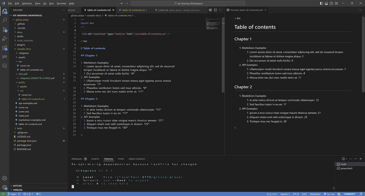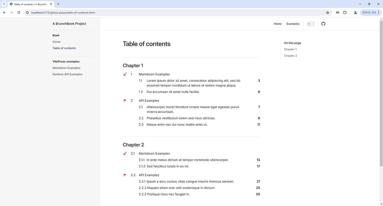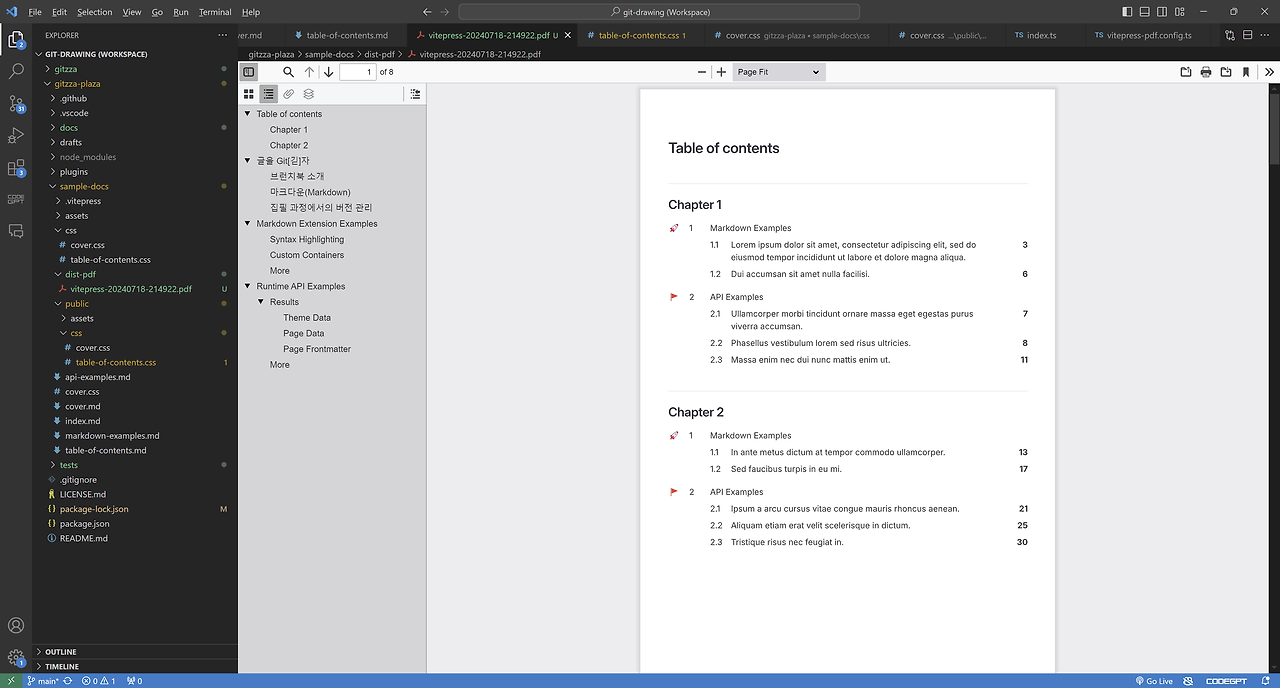 이번화에서 만든 목차 문서는 지난번의 표지와 다르게, 마크다운 문법이 차지하는 비중이 높습니다. 그리고, Frontmatter, HTML, VitePress 문법이 조금 적용되었습니다. 별도의 폰트 설정이 이루어지지는 않았는데, VitePress 페이지로 확인되는 결과와 PDF 문서로 확인되는 결과에 크게 차이가 없는 것이 확인됩니다.