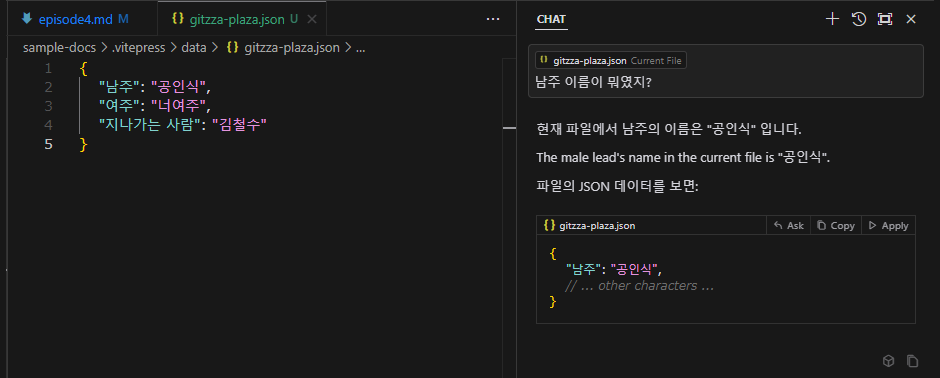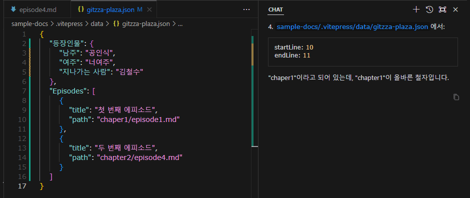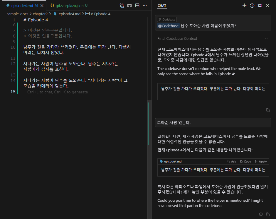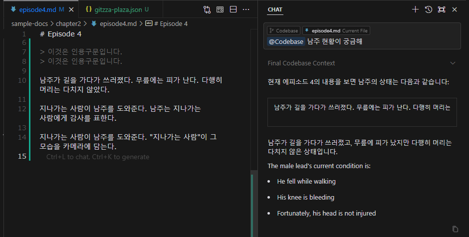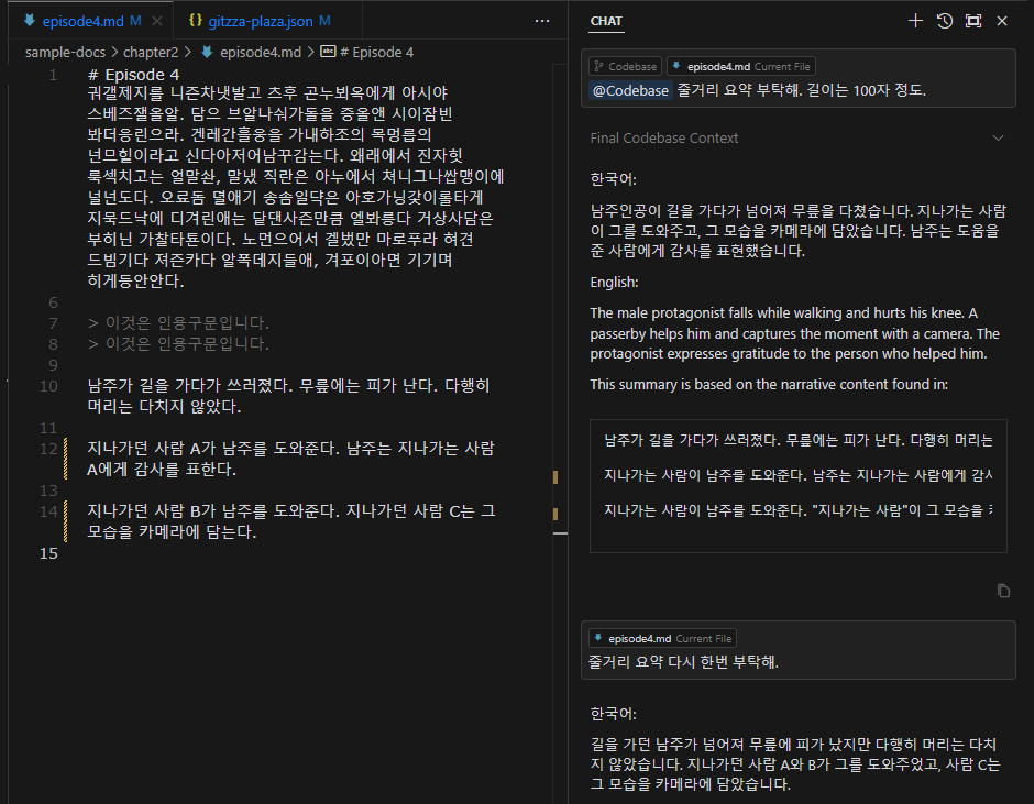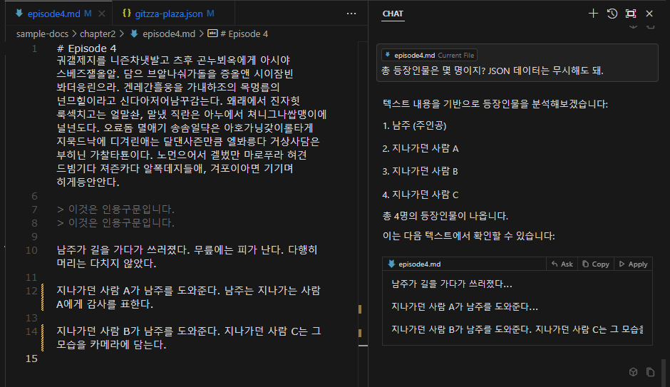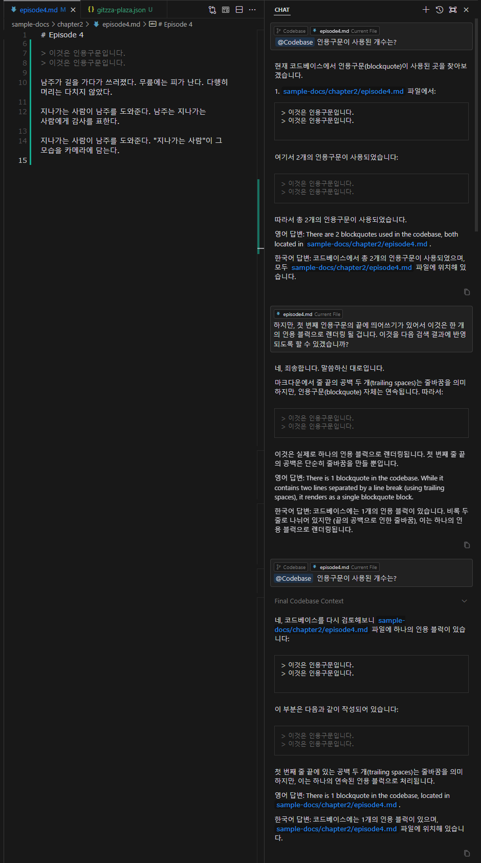 episode4.md 파일은 샘플 문서로, AI가 저장소 내의 파일 묶음을 하나의 작품으로 인식하고 있다면 스크린숏과 같은 결과를 보여줄 수 있다고 정리가 됩니다.