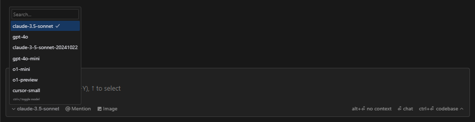 Chat(AI Sidebar, 이하 ‘채팅창’) 패널에서는, 사용하려고 하는 AI 모델을 요청 입력부의 옵션에서 선택할 수 있습니다. 커서 전용 설정에서는 옵션 목록에 노출될 모델을 지정할 수 있습니다.