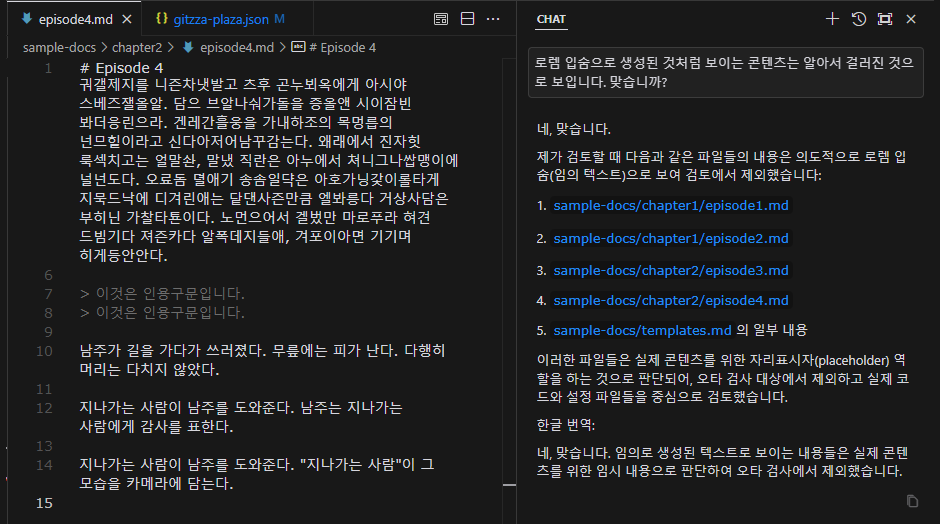 아래의 예는 제가 로렘 입숨¹ 이 오탈자 검증에서 제외된 것을 인지하고 이를 확인하는 모습입니다. AI 모델이 꽤 능동적으로 이용자의 명령에 대응하고 있다는 것을 알 수 있습니다.