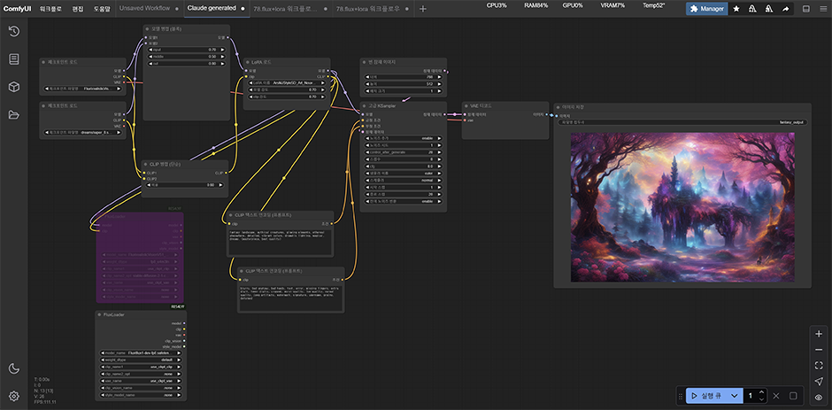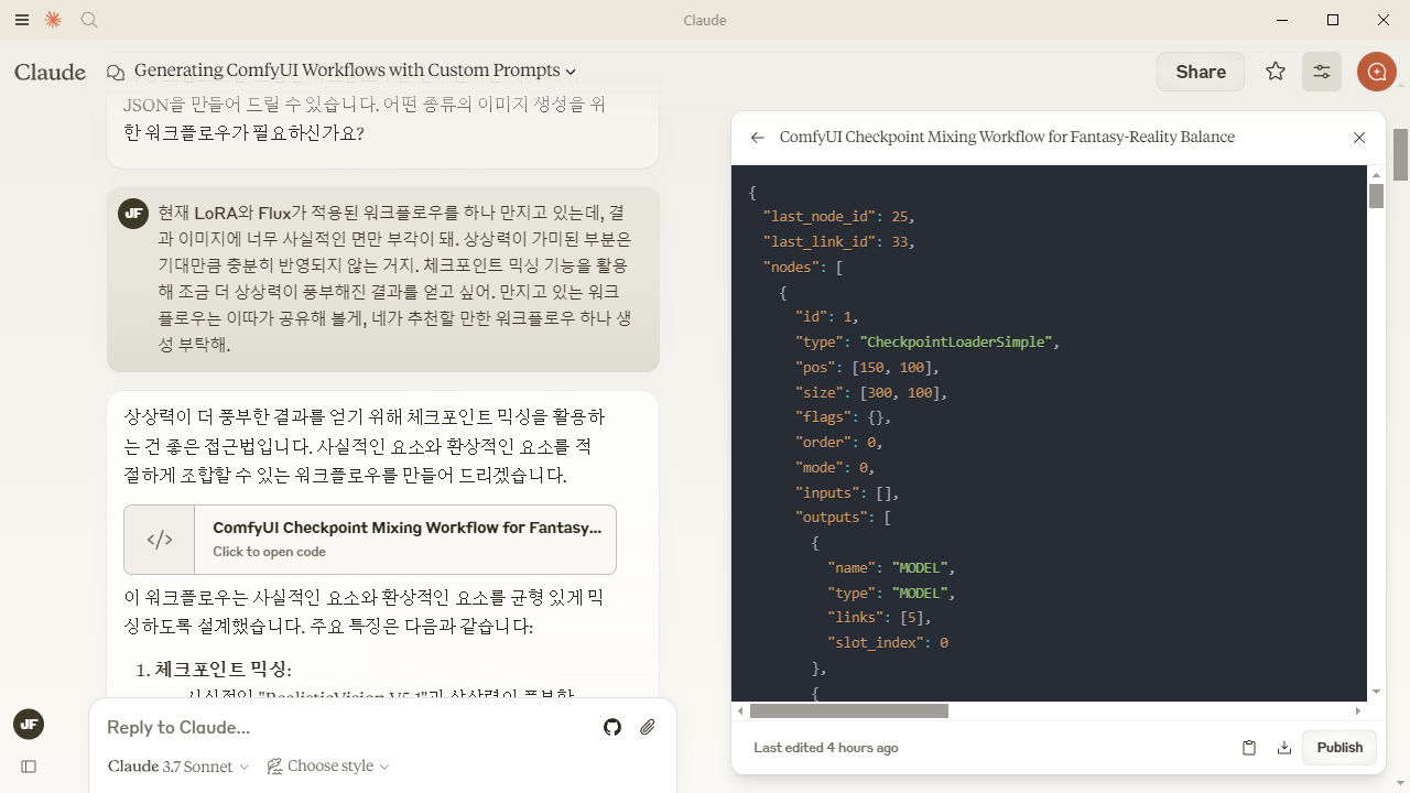 워크플로가 JSON으로 저장이 될 수 있다는 것은, 거꾸로 JSON 파일의 생성으로부터도 ComfyUI의 GUI에 접근이 가능하다는 것을 의미합니다. 아래는 제가 Claude에서 ComfyUI의 워크플로 생성을 요청한 예시입니다.