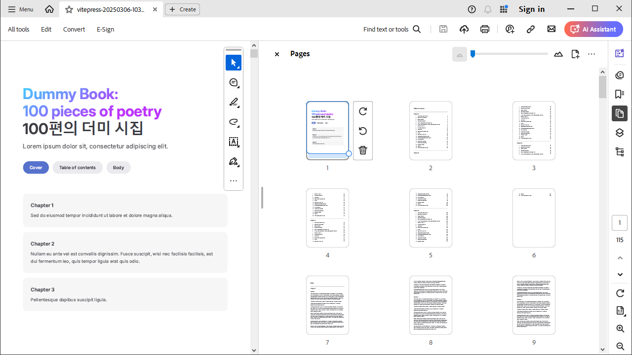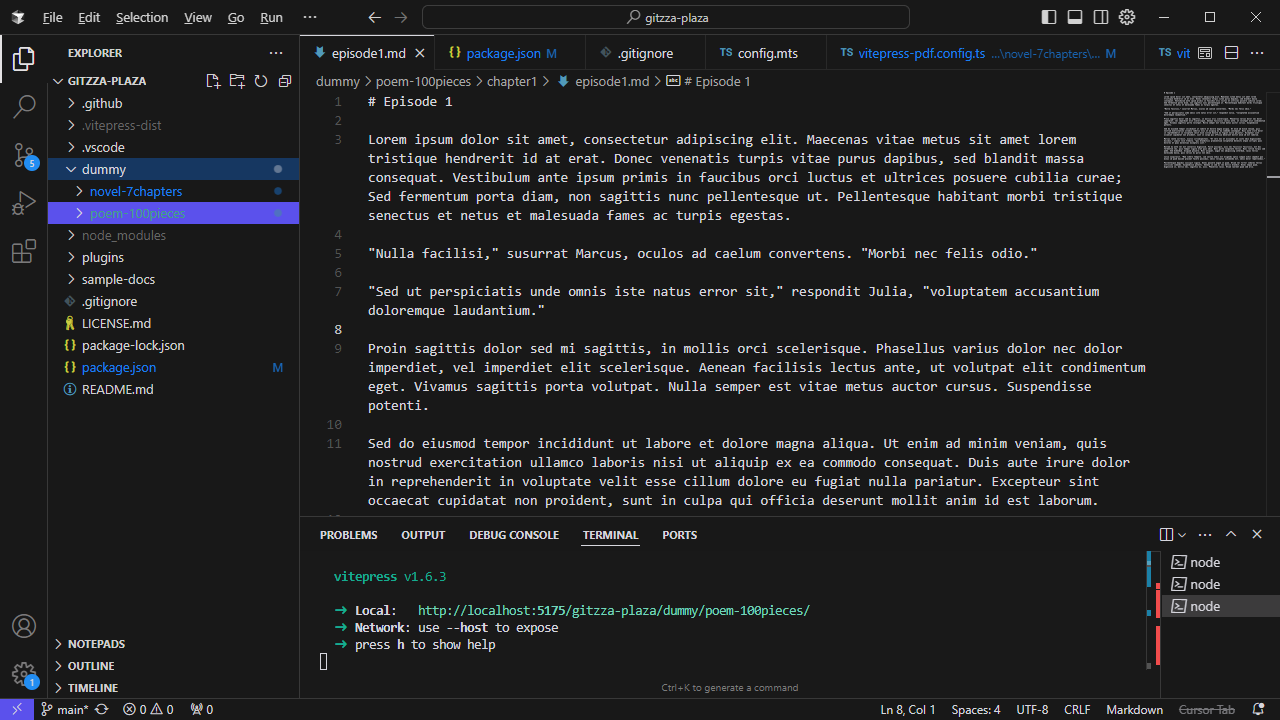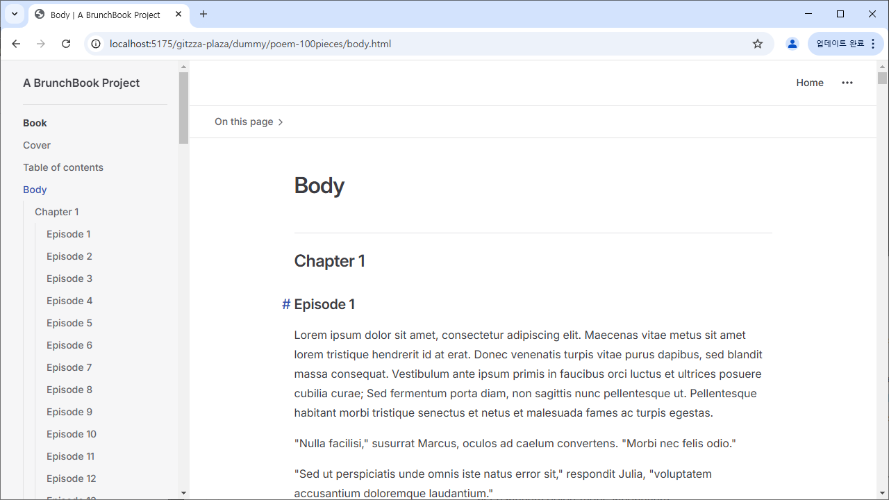 앞서 저장소의 루트에 dummy라는 폴더가 추가됐습니다. 그리고 그 아래로 100편의 시집을 위한 목업을 위해 poem-100pieces 폴더가 생성되어 있고, 이 안의 구성은 sample-docs의 것과 비슷하다고 정리하시면 됩니다. 각 챕터에는 총 20편의 시를 위한 마크다운 문서가 들어 있으며, 챕터 5까지 하면 총 100편입니다.