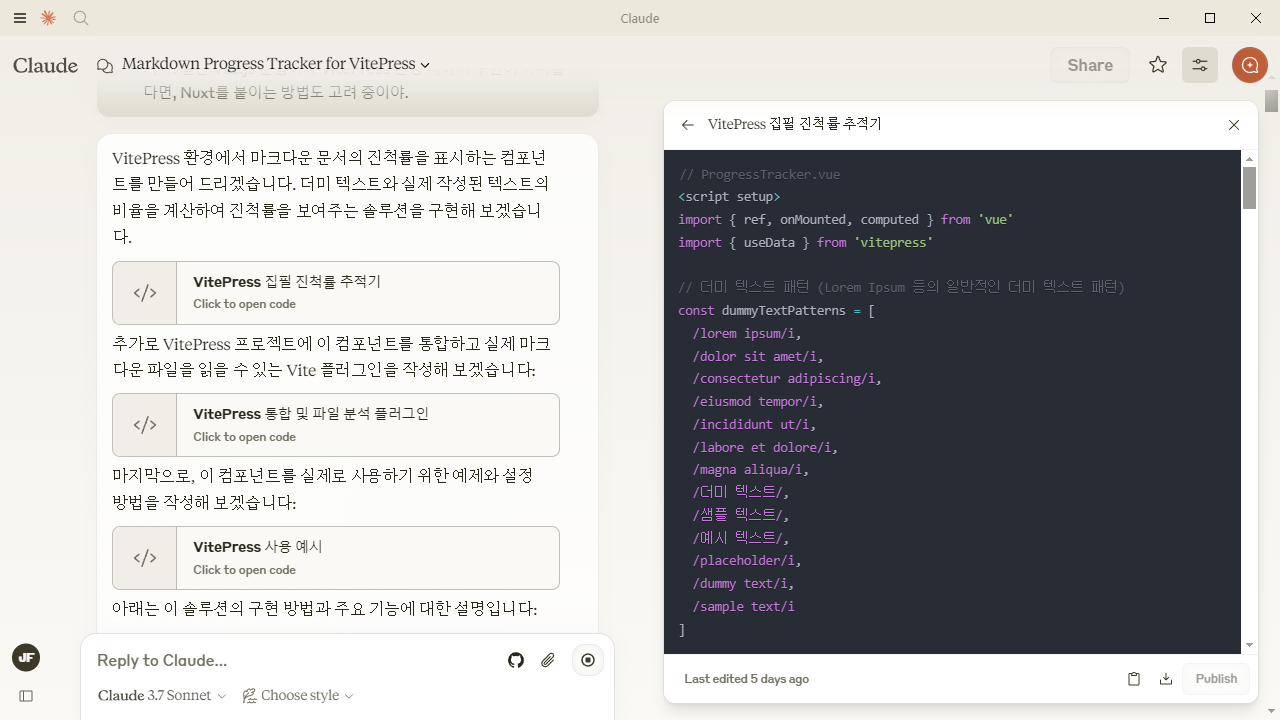 이번 화를 준비하면서 문득 든 생각은 ‘목표한 분량이 있다면 진척률도 산출해 낼 수 있지 않을까?’ 였습니다. 역시나, 클로드에 원하는 것을 이야기하니 아래와 같이 바로 적용할 수 있는 코드들을 거침없이 짜냅니다.