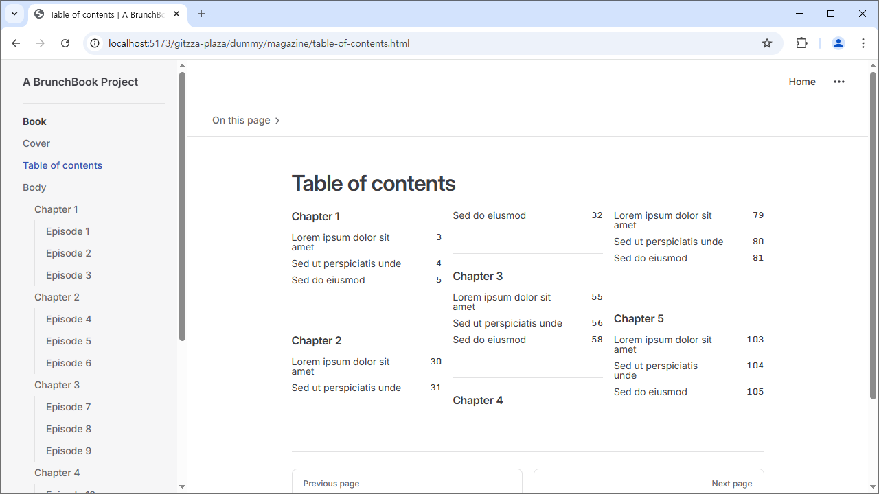 로컬에서는 아래 경로로 추가된 목업 책의 메인 화면을 보실 수 있습니다. 포트는 다를 수 있습니다. 제 경우에는 sample-docs가 5173 포트에서 먼저 구동 중이라, 추가된 폴더의 것은 5176 포트에서 구동되고 있습니다.