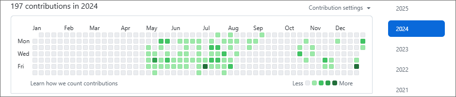 배워야 할 것들을 바둑판 위의 네모난 칸처럼 표현하자면, ‘배움은 한쪽으로 끊임없이 뻗어 나가는 인생이라는 격자판에 내가 배운 것들을 꾸준히 채워 나가는 행위’로 정리할 수도 있습니다. GitHub의 개인 계정 Overview 페이지에는 저의 이런 정리를 옮겨 놓은 듯한 모양의 그래프를 하나 볼 수 있습니다. 이용자의 연간 저장소(또는 생태계)의 기여도를 나타낸 것인데, 이렇게 그래프에 녹색점이 찍히도록 하는 것을 개발자 커뮤니티의 누군가는 ‘잔디심기’라고 표현하기도 합니다.