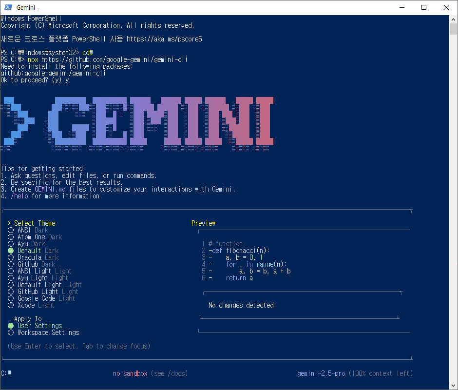 두 종류의 사이드바에서 운용 가능하며, 주 사이드바에서 구동되면 활동 바에 Gemini 아이콘이 표시됩니다. 보조 사이드바에서는 ‘Gemini Code Assist’ 탭으로 구동됩니다.