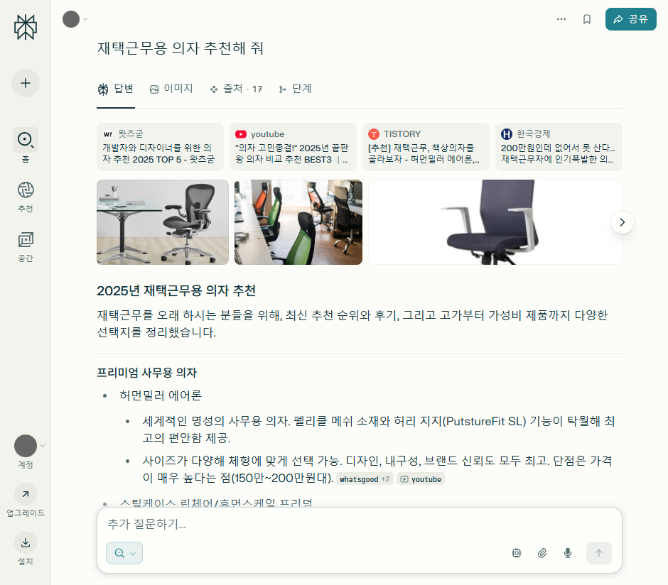 27세 직장인 이민호 씨(가명)는 최근 “재택근무용 의자 추천해 줘”라고 Perplexity(퍼플렉시티)에 질문했다. 돌아온 답변에는 허리 건강을 고려한 의자 3개가 상세한 설명과 함께 제시되었다. 가격 비교는 물론, 각 의자의 장단점까지 정리되어 있었다.
