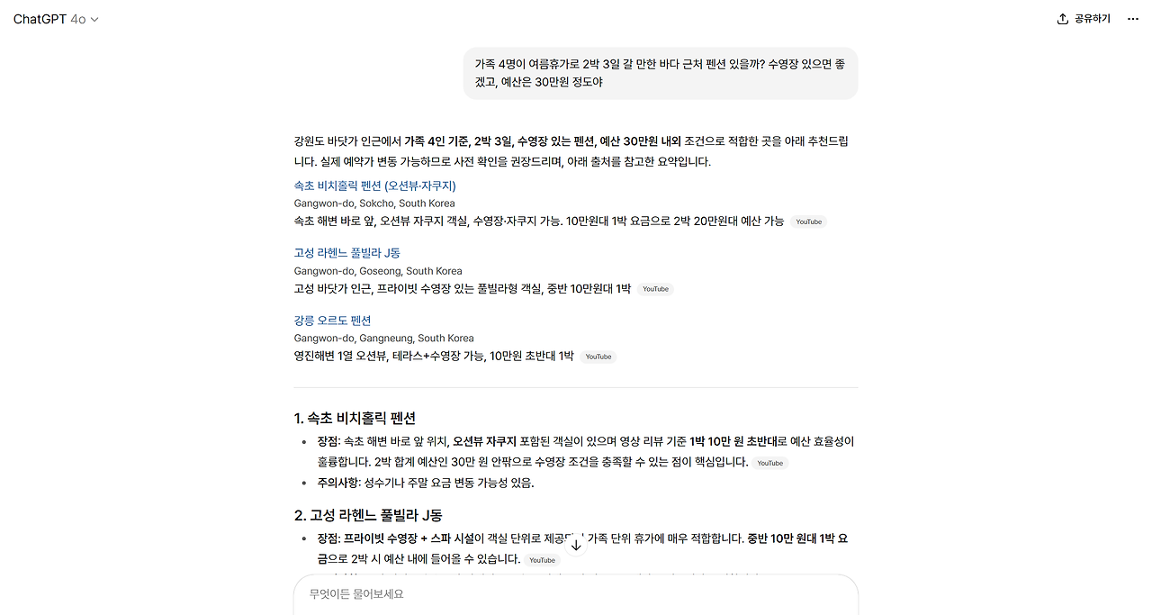 월요일 아침, 커피를 마시며 무심코 ChatGPT에 던진 질문이었다. 몇 초 만에 돌아온 답변에는 제주도의 한 펜션이 상세히 소개되어 있었다. 위치, 가격, 특징까지. 마치 여행 전문가가 직접 추천해 주는 것 같았다.