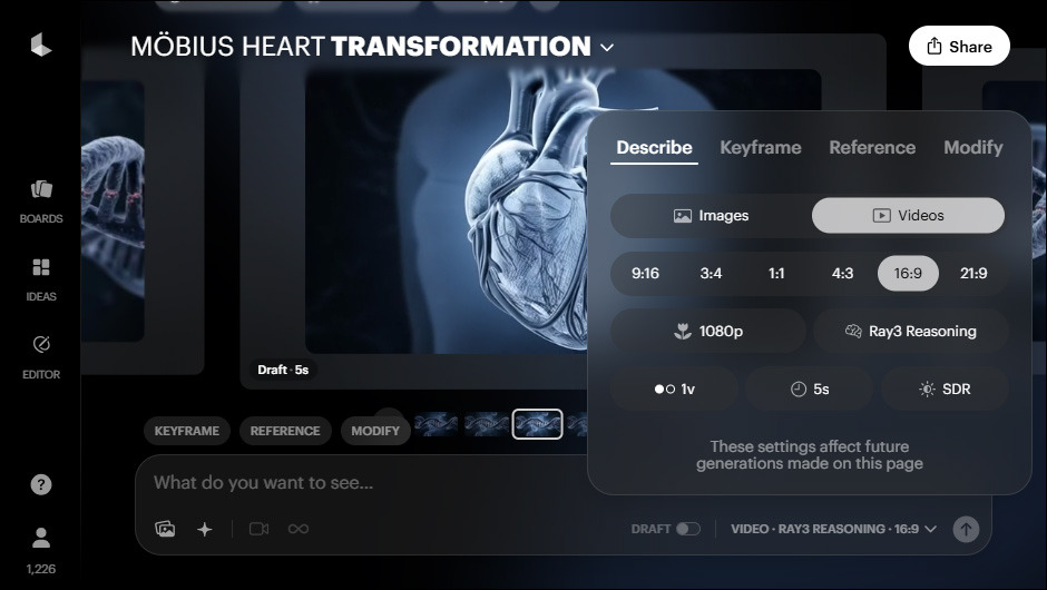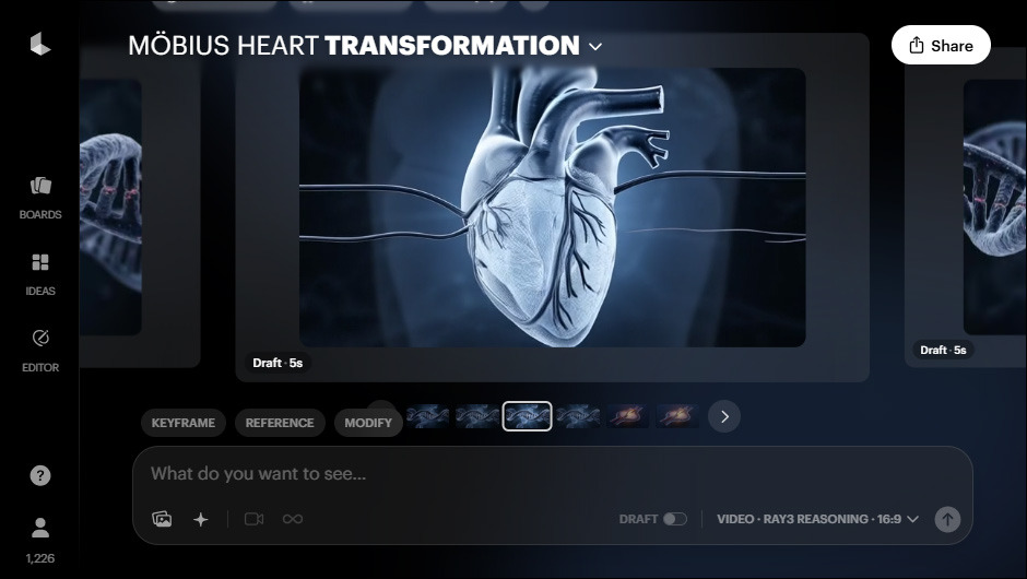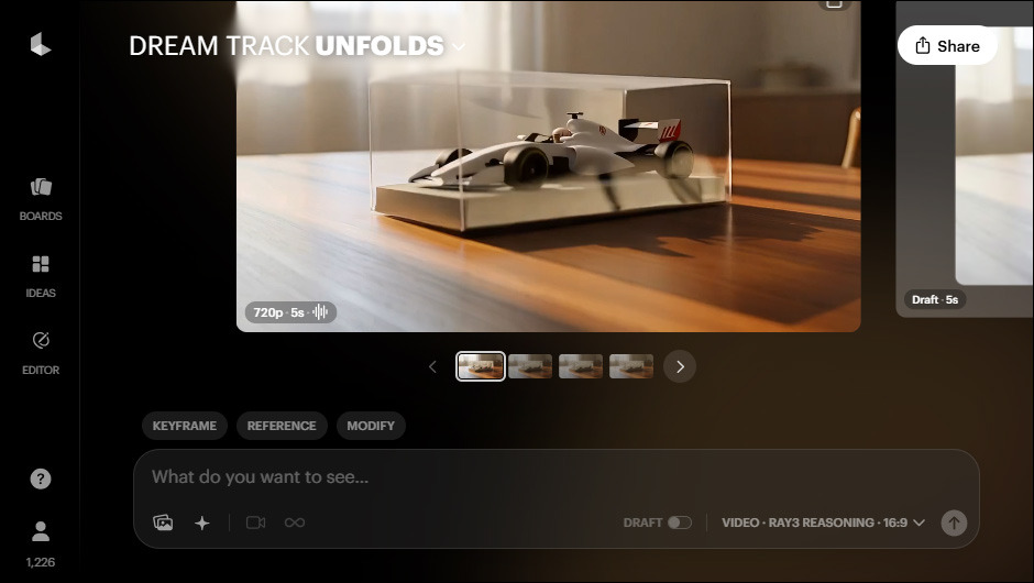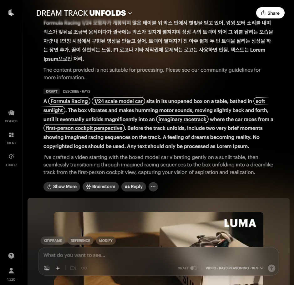 에이전트 모드를 쓸 수 있는 코드 에디터를 사용하다 보면, AI 모델 자체적으로 중간 결과물을 점검하며 완성도 있는 결과물을 위해 계획을 수정하는 모습을 볼 수 있습니다. Luma AI의 이전 모델은 어땠는지 모르겠지만, Ray3는 그런 에이전트 모드를 기본적으로 지원하고 있는 것처럼 보입니다.