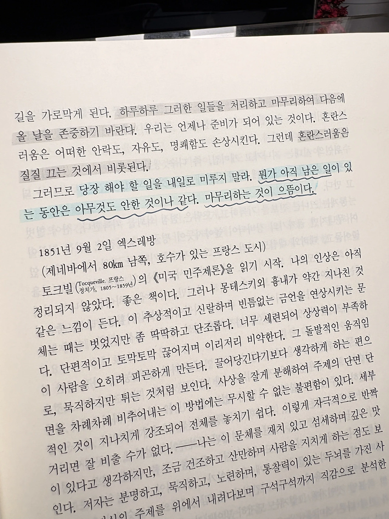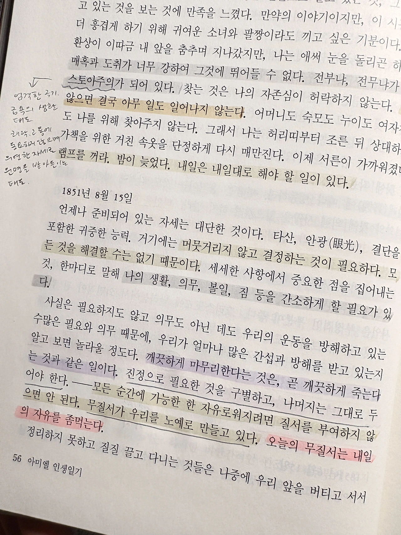 지금이라도 나만의 질서를 정립해야 한다. 그래야 소로의 말처럼, 아미엘의 경고처럼 자기가 자신의 노예 주인이 되는 삶을 벗어날 수 있다.