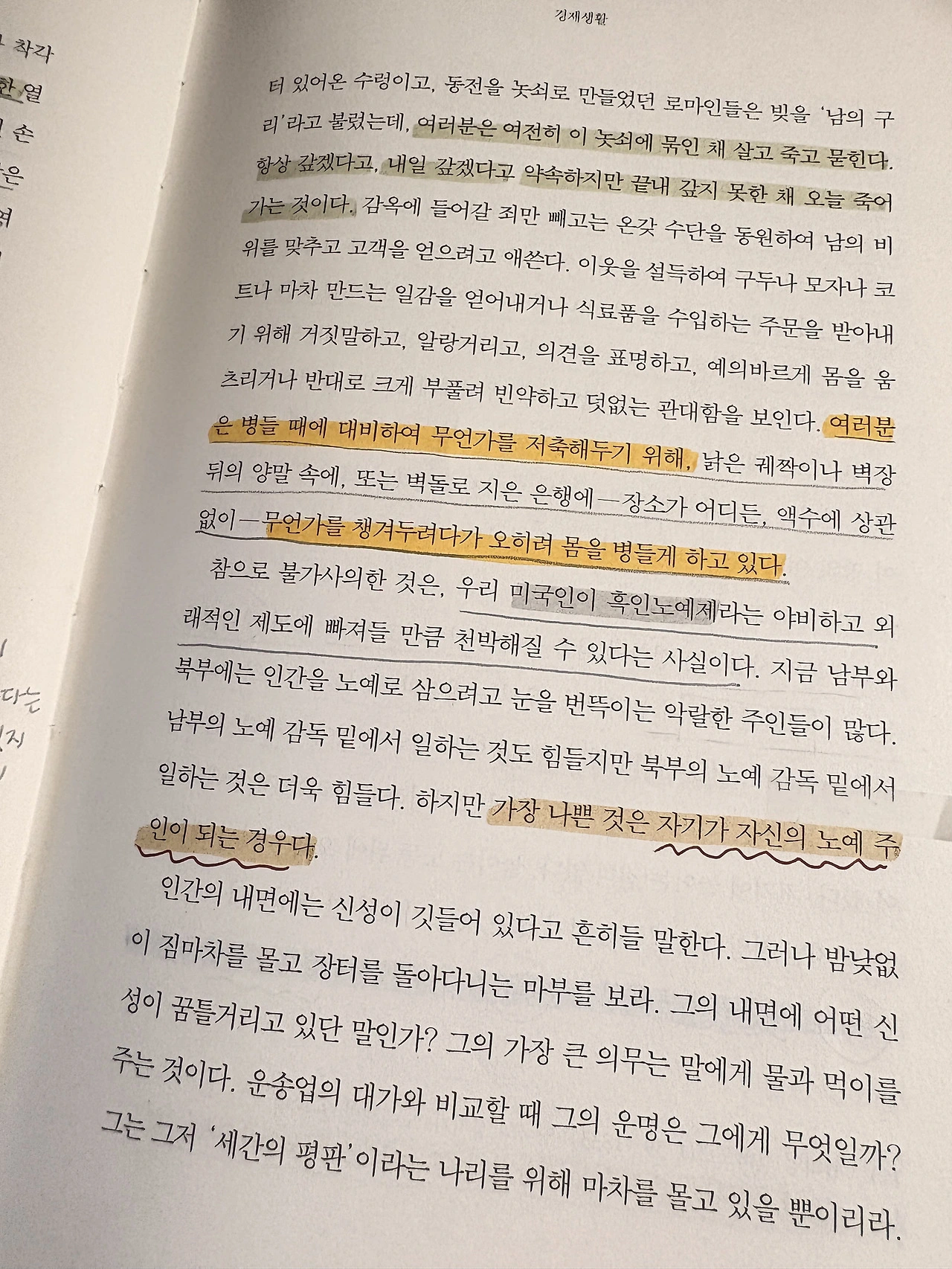 ".... 일자리를 얻으려고, 빗더미에서 빠져나가려 애쓰느라 여러분은 늘 한계점에 다다라 있다. (중략) 여러분은 여전히 이 놋쇠에 (동전)에 묶인 채 살고 죽고 묻힌다. 항상 갚겠다고, 내일 갚겠다고, 약속하지만 끝내 갚지 못한 채 오늘 죽어 가는 것이다. " (면 12,13)