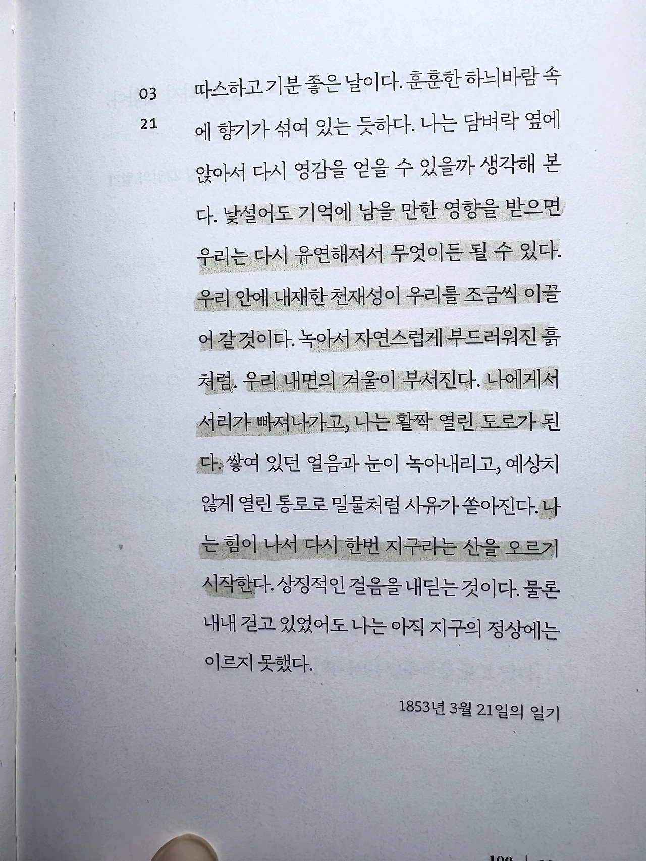 "낯설어도 기억에 남을 만한 영향을 받으면 우리는 다시 유연해져서 무엇이든 될 수 있다. 우리 안에 내재한 천재성이 우리를 조금씩 이끌어 갈 것이다. 녹아서 자연스럽게 부드러워진 흙처럼. 우리 내면의 겨울이 부서진다. 나에게서 서리가 빠져나가고, 나는 활짝 열린 도로가 된다. 쌓여 있던 얼음과 눈이 녹아내리고, 예상치 않게 열린 통로로 밀물처럼 사유가 쏟아진다. 나는 힘이 나서 다시 한번 지구라는 산을 오르기 시작한다." (101면)
