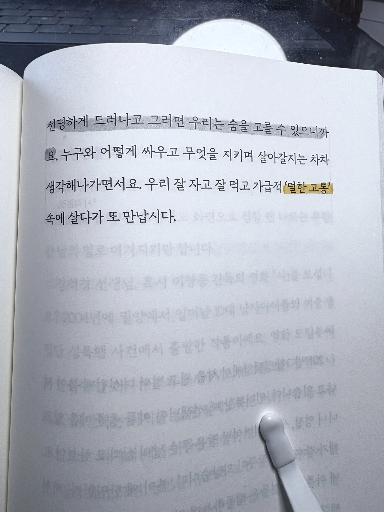 "불면이 글을 낳기도 하지만 어느 순간에 이르면 글이 또 숙면을 준다고 믿어요. 웅얼거리는 복잡한 생각들과 덩어리 감정들이 언어로 정돈되면 문제가 선명하게 드러나고 그러면 우리는 숨을 고를 수 있으니까요."