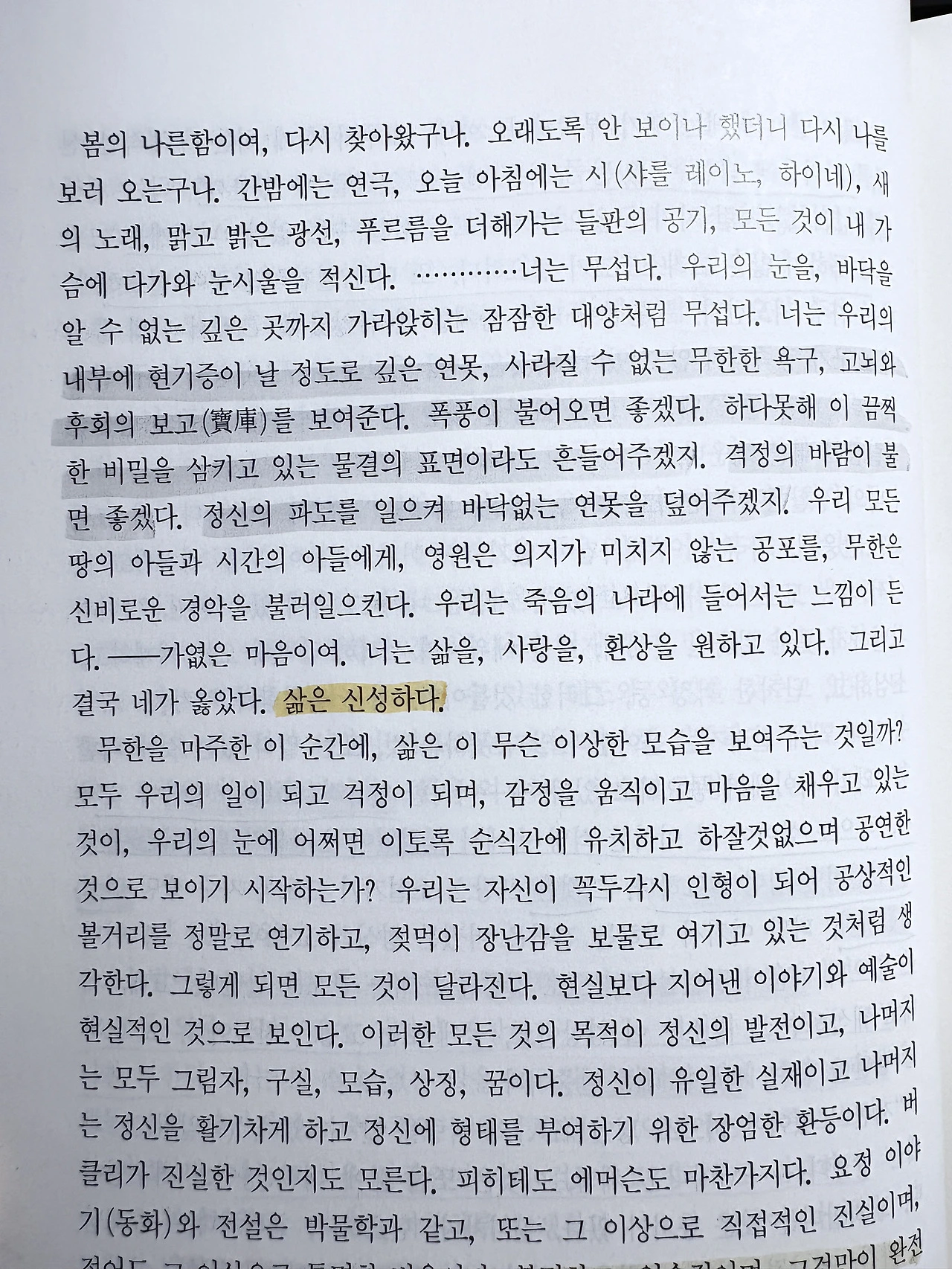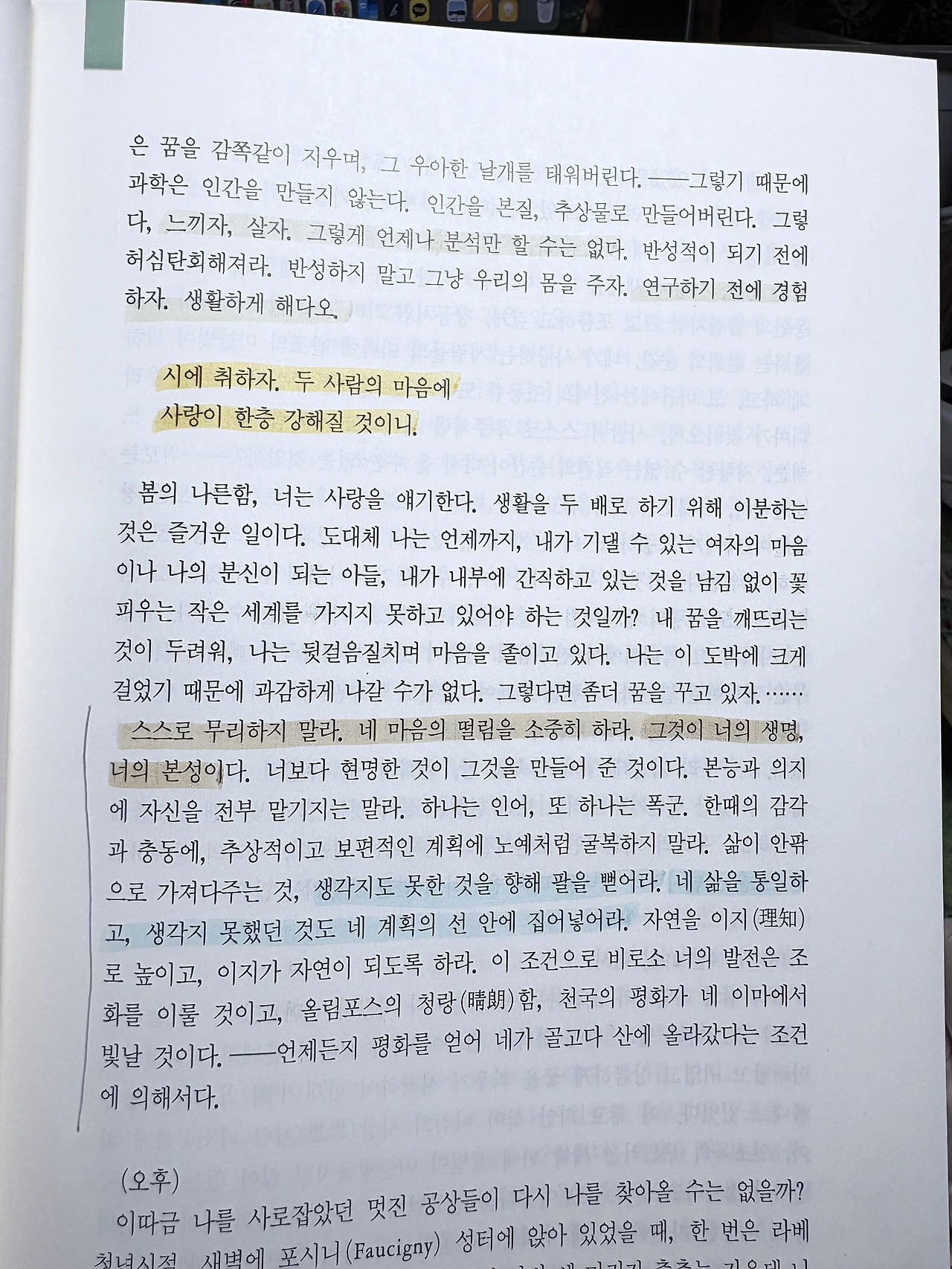 "스스로 무리하지 말라. 네 마음의 떨림을 소중히 하라. 그것이 너의 생명, 너의 본성이다. 너보다 현명한 것이 그것을 만들어 준 것이다. 본능과 의지에 자신을 전부 맡기지는 말라. 하나는 인어, 또 하나는 폭군. 한때의 감각과 충동에 추상적이고 보편적인 계획에 노예처럼 굴복하지 말라. 삶이 안팎으로 가져다주는 것, 생각지도 못한 것을 향해 팔을 뻗어라. 네 삶을 통일하고, 생각지 못했던 것도 네 계획의 선 안에 집어넣어라. 자연을 이지(理知)로 높이고, 이지가 자연이 되도록 하라. 이 조건으로 비로소 너의 발전은 조화를 이룰 것이고, 올림포스의 청랑함, 천국의 평화가 네 이마에서 빛날 것이다." (69면)