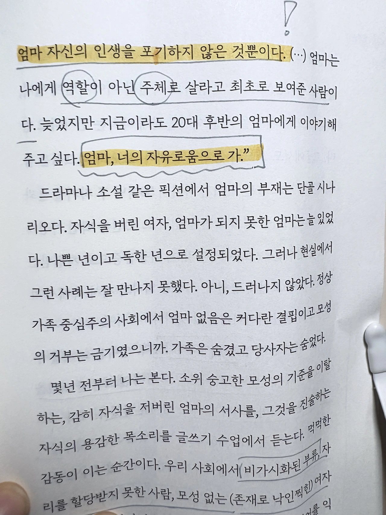 "그건 엄마가 나를 사랑하지 않는다는 의미가 아니었다. 엄마 자신의 인생을 포기하지 않은 것뿐이다. (...) 엄마는 나에게 역할이 아닌 주체로 살라고 최초로 보여준 사람이다. 늦었지만 지금이라도 20대 후반의 엄마에게 이야기해주고 싶다. 엄마, 너의 자유로움으로 가.". (193면)