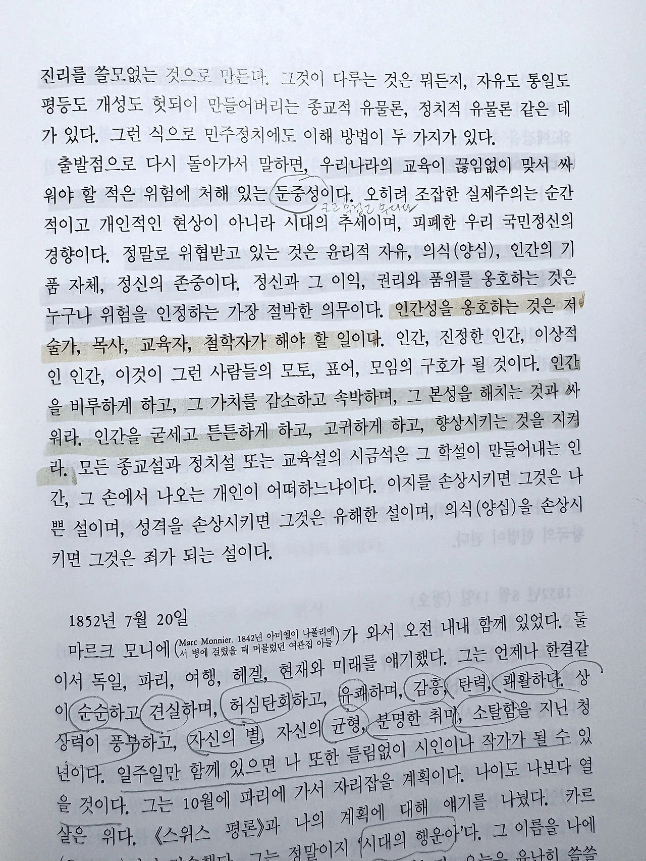 "우리나라의 교육이 끊임없이 맞서 싸워야 할 적은 위험에 처해 있는 둔중성이다. (중략) 정말로 위협받고 있는 것은 윤리적 사유, 의식(양심), 인간의 기품 자체, 정신의 존중이다. 정신과 그 이익, 권리와 품위를 옹호하는 것은 누구나 위험을 인정하는 가장 절박한 의무이다. 인간성을 옹호하는 것은 저술가, 목사, 교육자, 철학자가 해야 할 일이다. (중략) 인간을 비루하게 하고, 그 가치를 감소하고 속박하며, 그 본성을 해치는 것과 싸워라. 인간을 굳세고 튼튼하게 하고, 고귀하게 하고, 향상하는 것을 지켜라.". (75면)