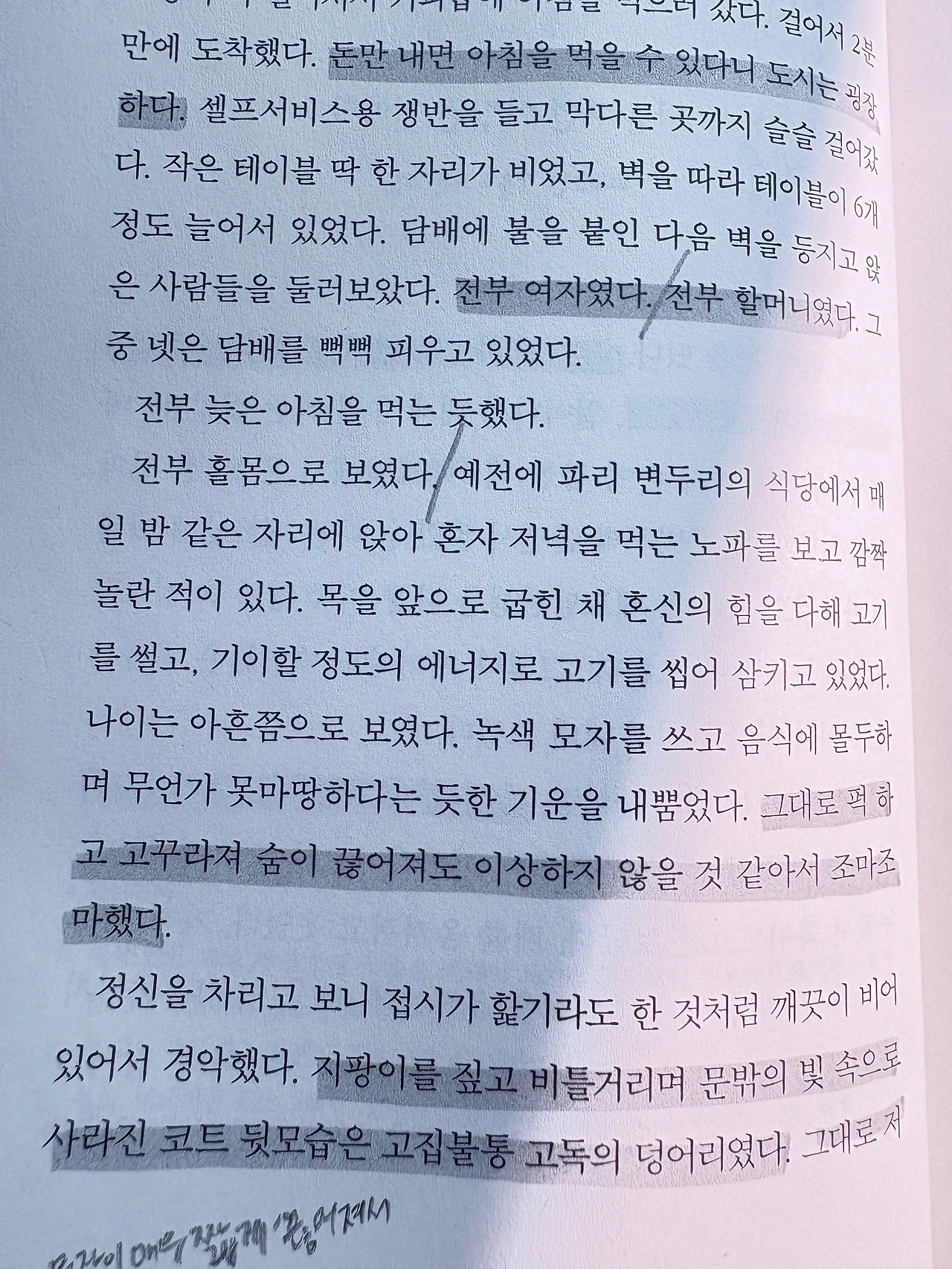 아침에 일어나서 슬리퍼를 끌고 카페에 가서 담배 한 대 피우며 주변 독거 할머니들을 관찰하는 그녀의 시선이 냉소적이면서도 엷은 미소를 짓게 한다.