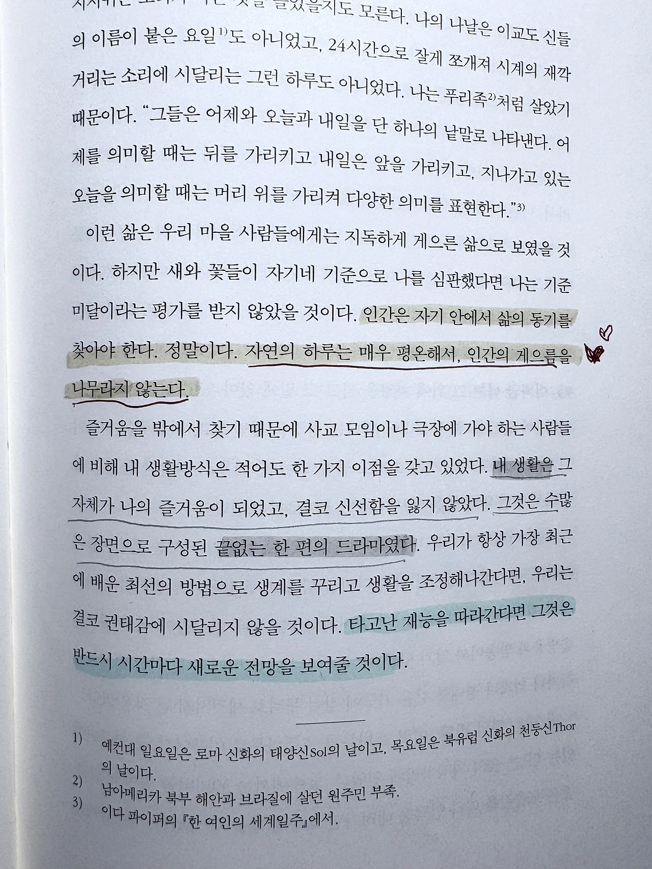 "인간은 자기 안에서 삶의 동기를 찾아야 한다. 정말이다. 자연의 하루는 매우 평온해서, 인간의 게으름을 나무라지 않는다." (173면)