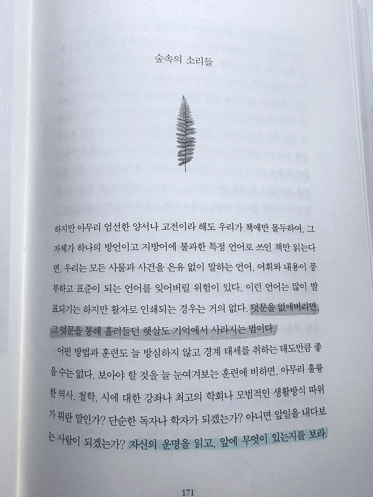 오늘 읽은 부분은 <월든-숲 속의 소리들> 부분이다. 어느덧 500페이지 중에 171페이지에 접어들었다.