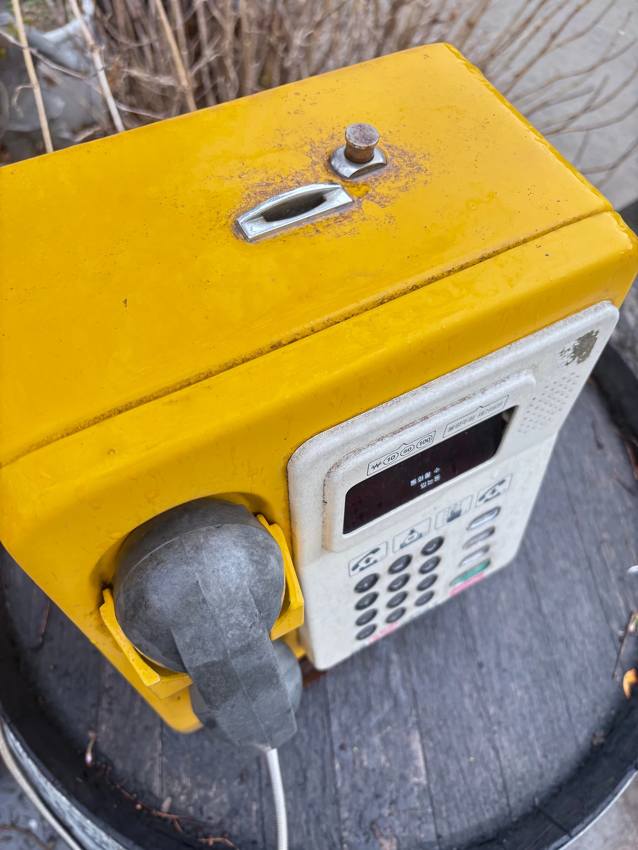 - 전화기에 스티커가 붙었다 떨어진 자국이 두 군데 있는데 무슨 스티거였을까? 아래쪽은 왠지 공중전화 예절이나 사용법 같은 게 적혀있었을 것 같고 윗부분 스티커는 어떤 꼬마가 붙여둔 만화 스티커였을 것 같다.