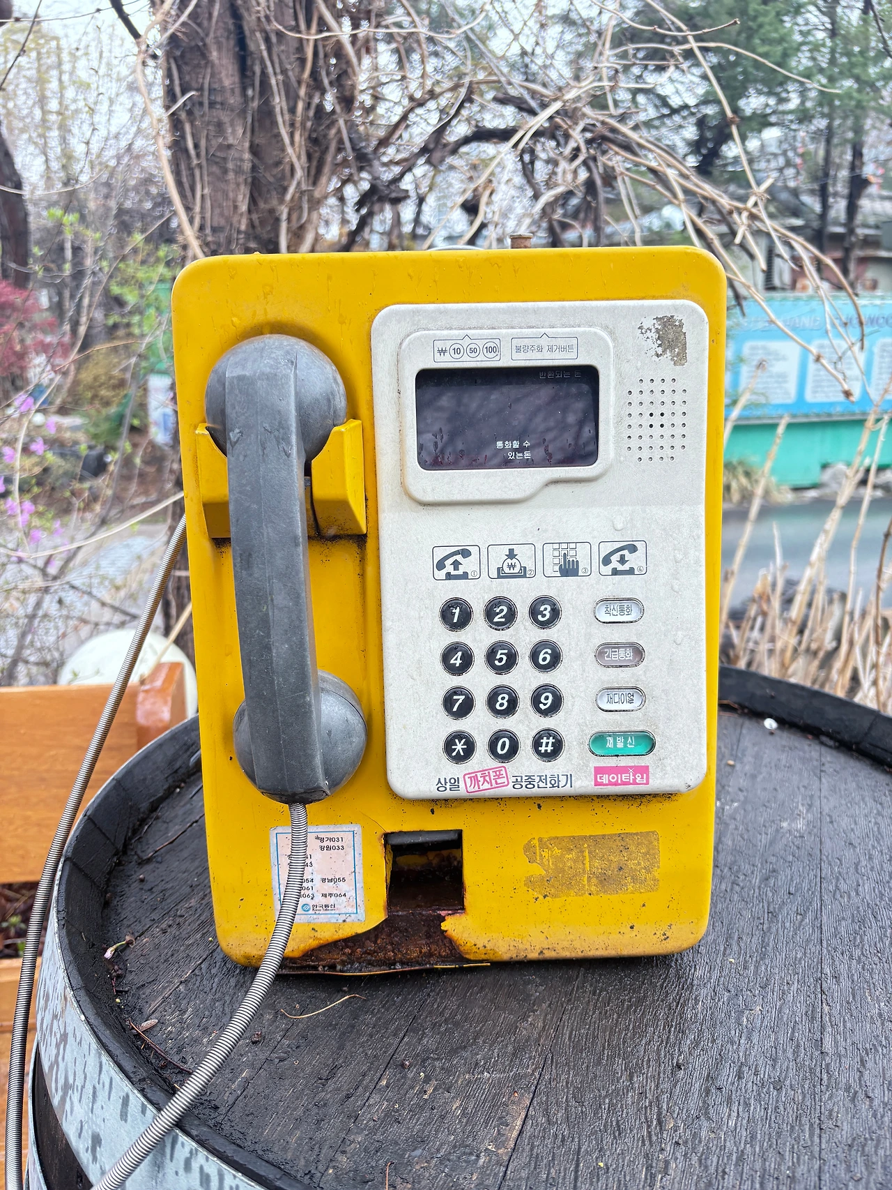 - 진노랑색 공중전화는 처음 봤다. 내가 좋아하는 꽃무늬나 호피무늬 전화기도 있으면 좋을 텐데.