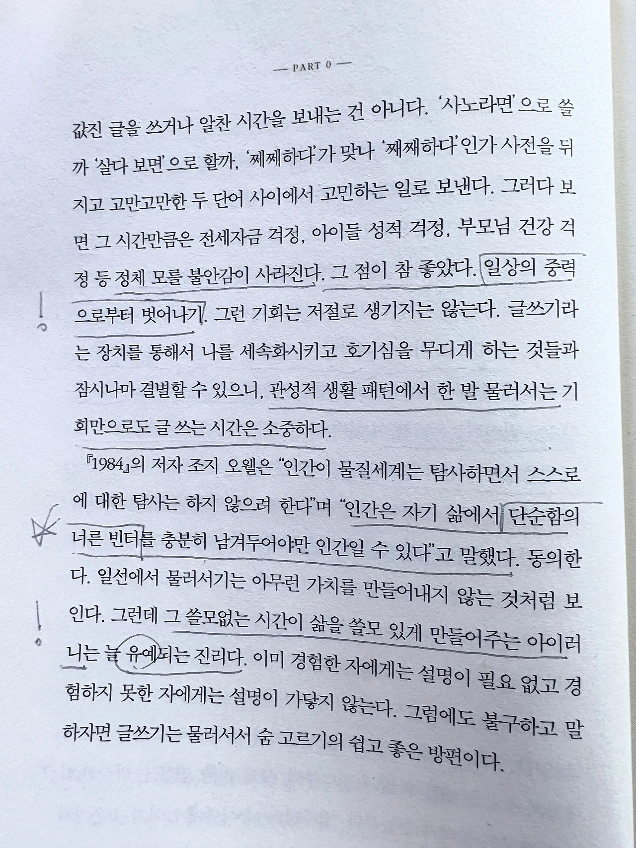 오늘은 [물러앉기] - 글쓰기는 오롯이 “나”와 대면하는 시간이다. 번잡한 일상에서 벗어날 수 있다. 일상에서 생기는 정체 모를 불안감이 사라지고, 관성적 생활 패턴에서 한 발 물러설 수 있다.
