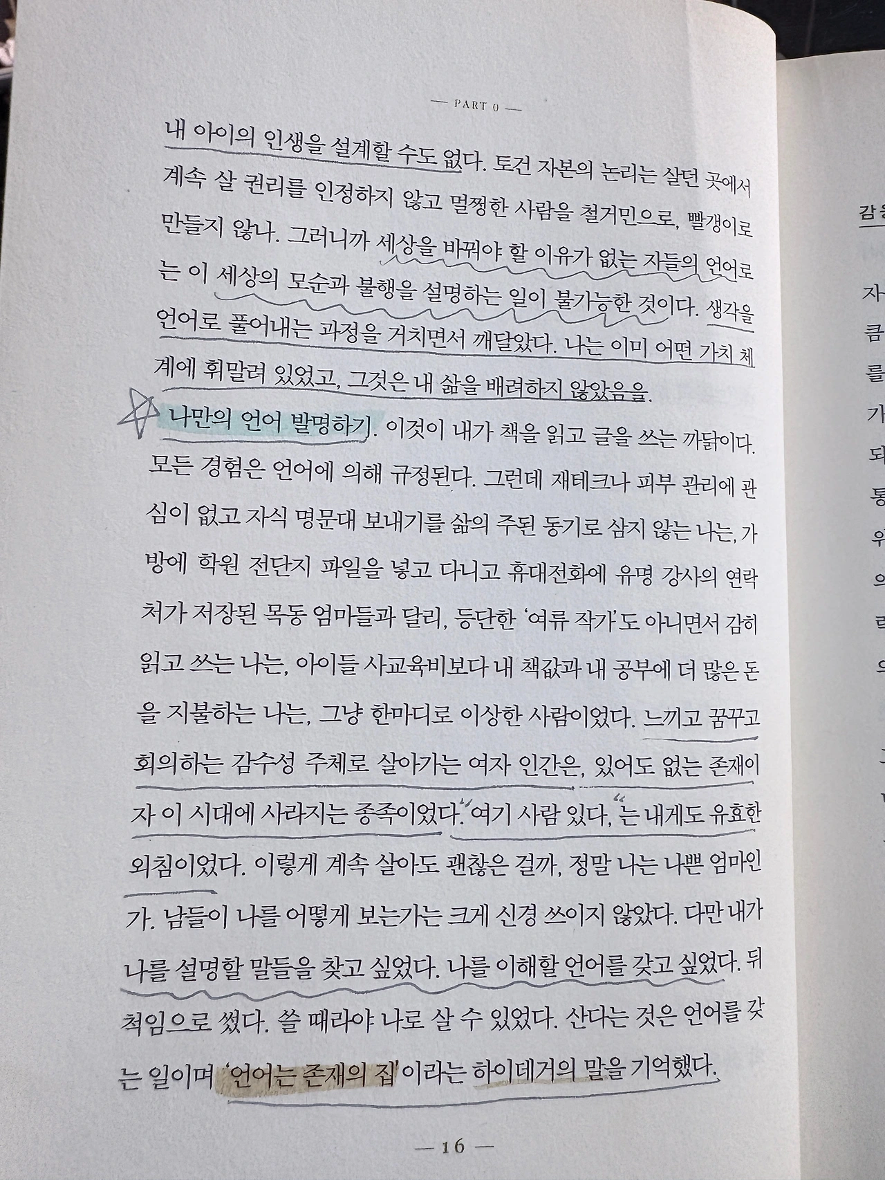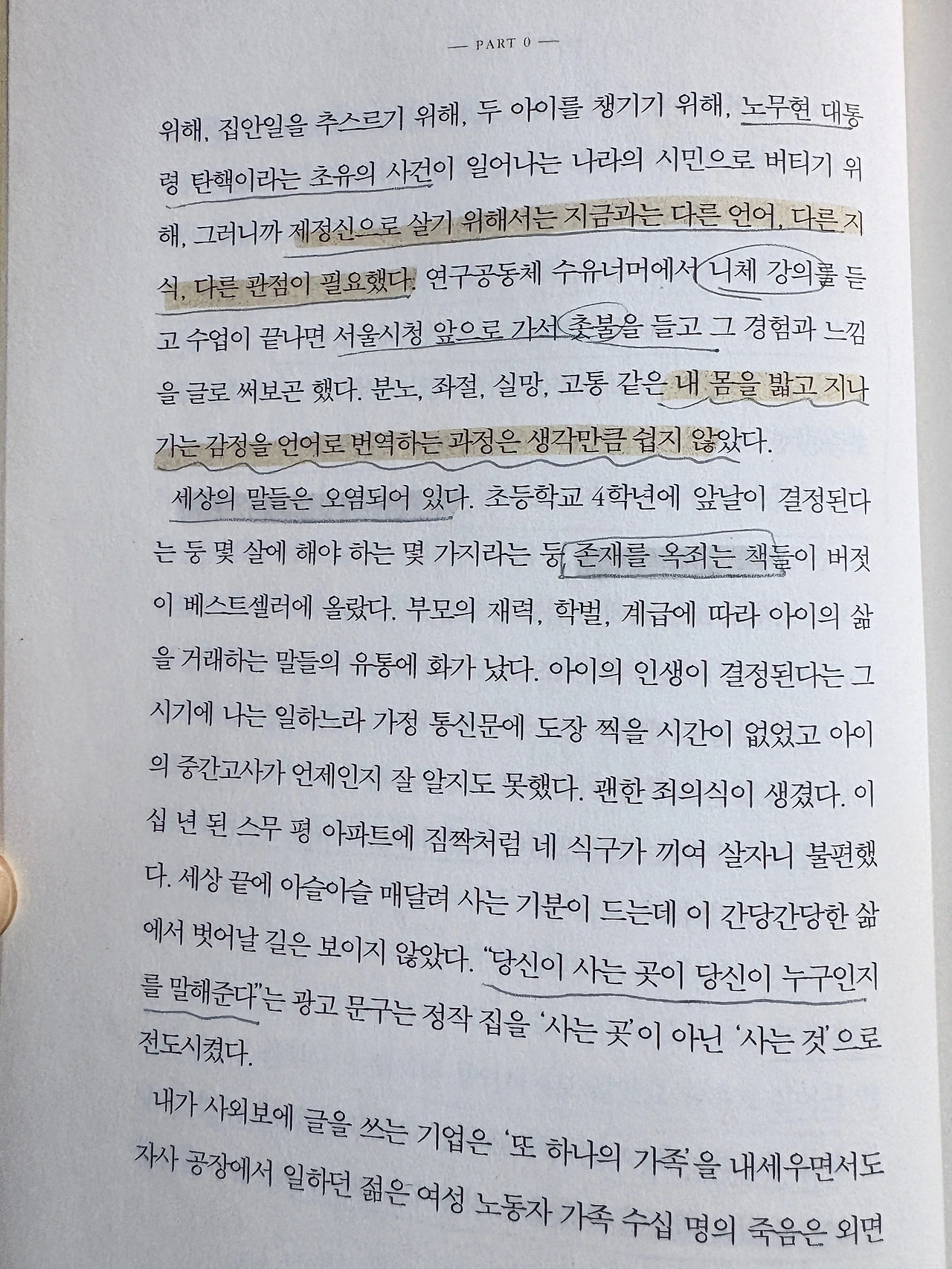 "제정신으로 살기 위해서는 지금과는 다른 언어, 다른 지식, 다른 관점이 필요했다. (...) 분노, 좌절, 실망, 고통 같은 내 몸을 밟고 지나가는 감정을 언어로 번역하는 과정은 생각만큼 쉽지 않았다." (14면)