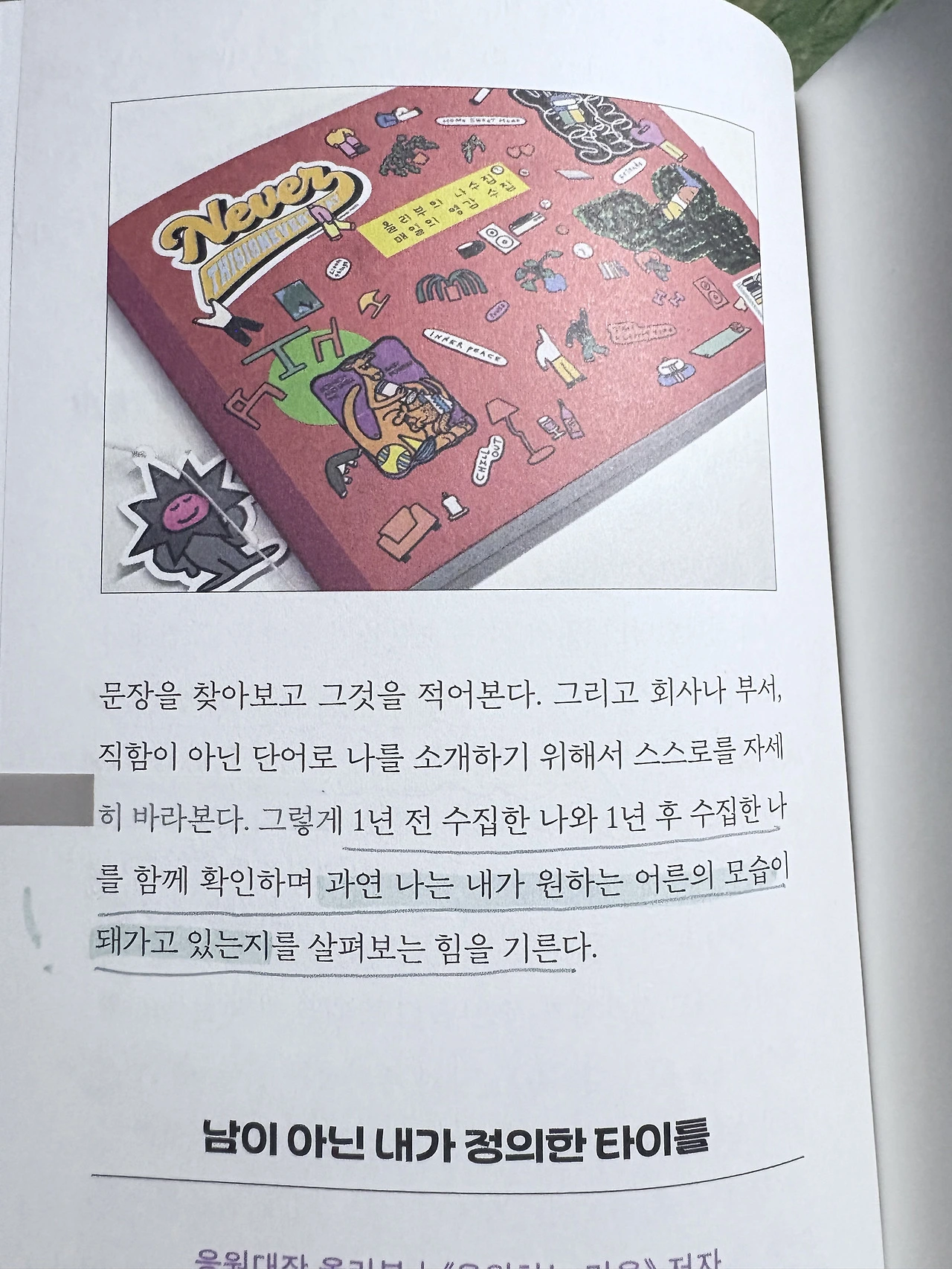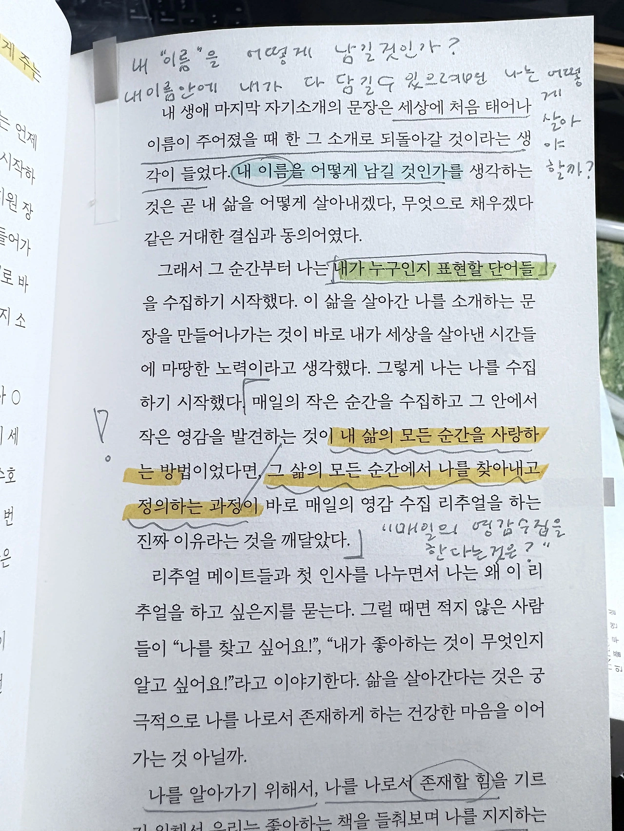 작가는 "내가 되고 싶은 모습의 단어를 수집하고 그 후 어떤 시간을 보냈는지 회고하면서 나를 수집하기도 한다" (176면)고 말한다.