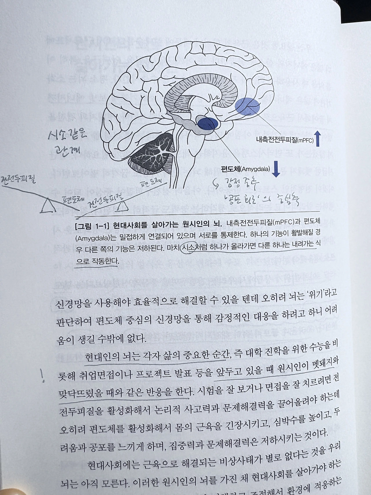 우리는 위기 상황에서 편도체 중심의 신경망에 더 많이 의존하며 두려움과 공포라는 감정을 불러일으킨다고 한다. 그래야 생존에 도움이 되기 때문이라고...