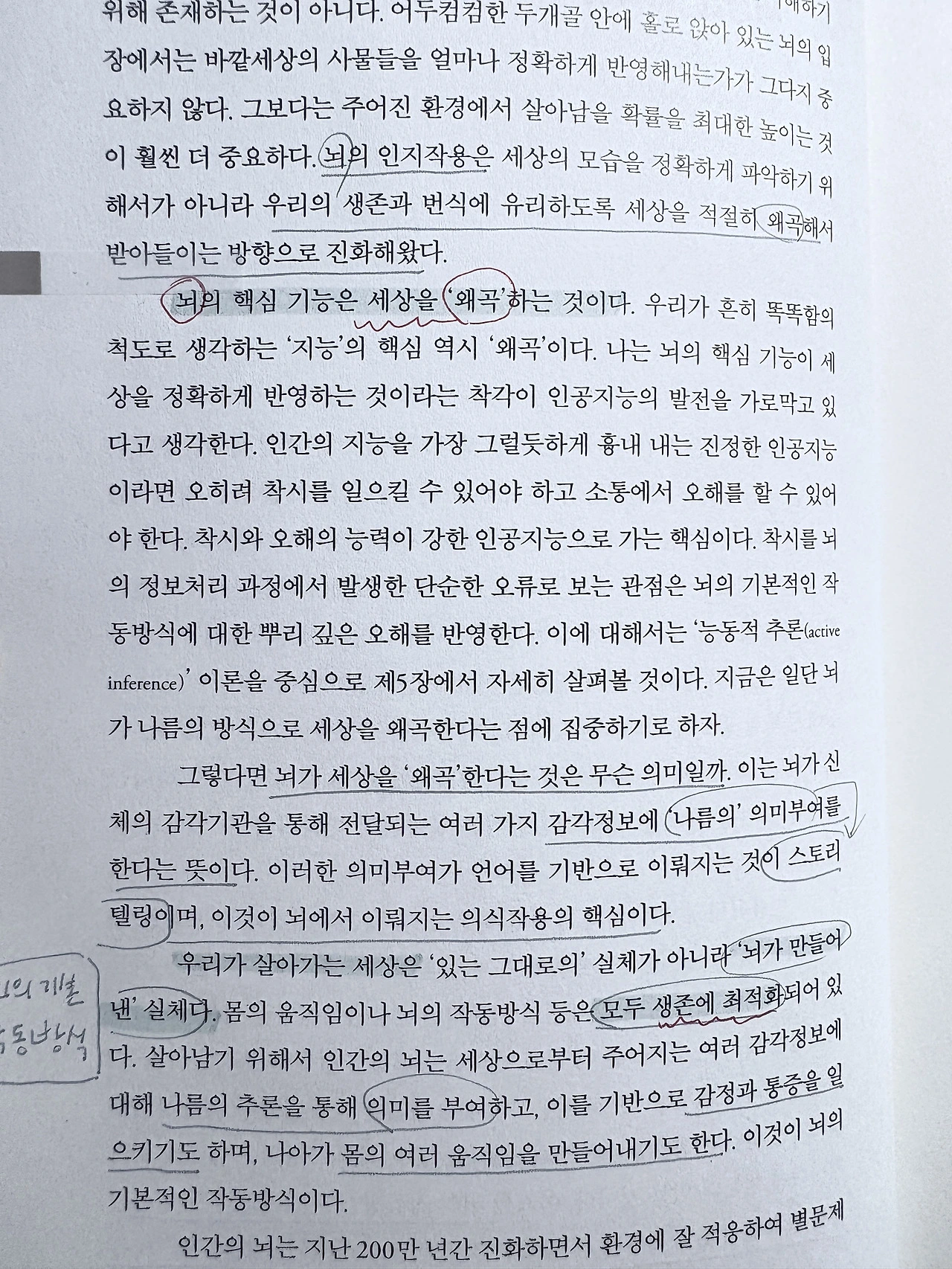 "우리가 살아가는 세상은 '있는 그대로의' 실체가 아니라 '뇌가 만들어 낸' 실체다. 몸의 움직임이나 뇌의 작동방식 등은 모두 생존에 최적화되어 있다. 살아남기 위해서 인간의 뇌는 세상으로부터 주어지는 여러 감각정보에 대해 나름의 추론을 통해 의미를 부여하고, 이를 기반으로 감정과 통증을 일으키기도 하며, 나아가 몸의 여러 움직임을 만들어내기도 한다. 이것이 뇌의 기본적인 작동방식이다.". (034면)