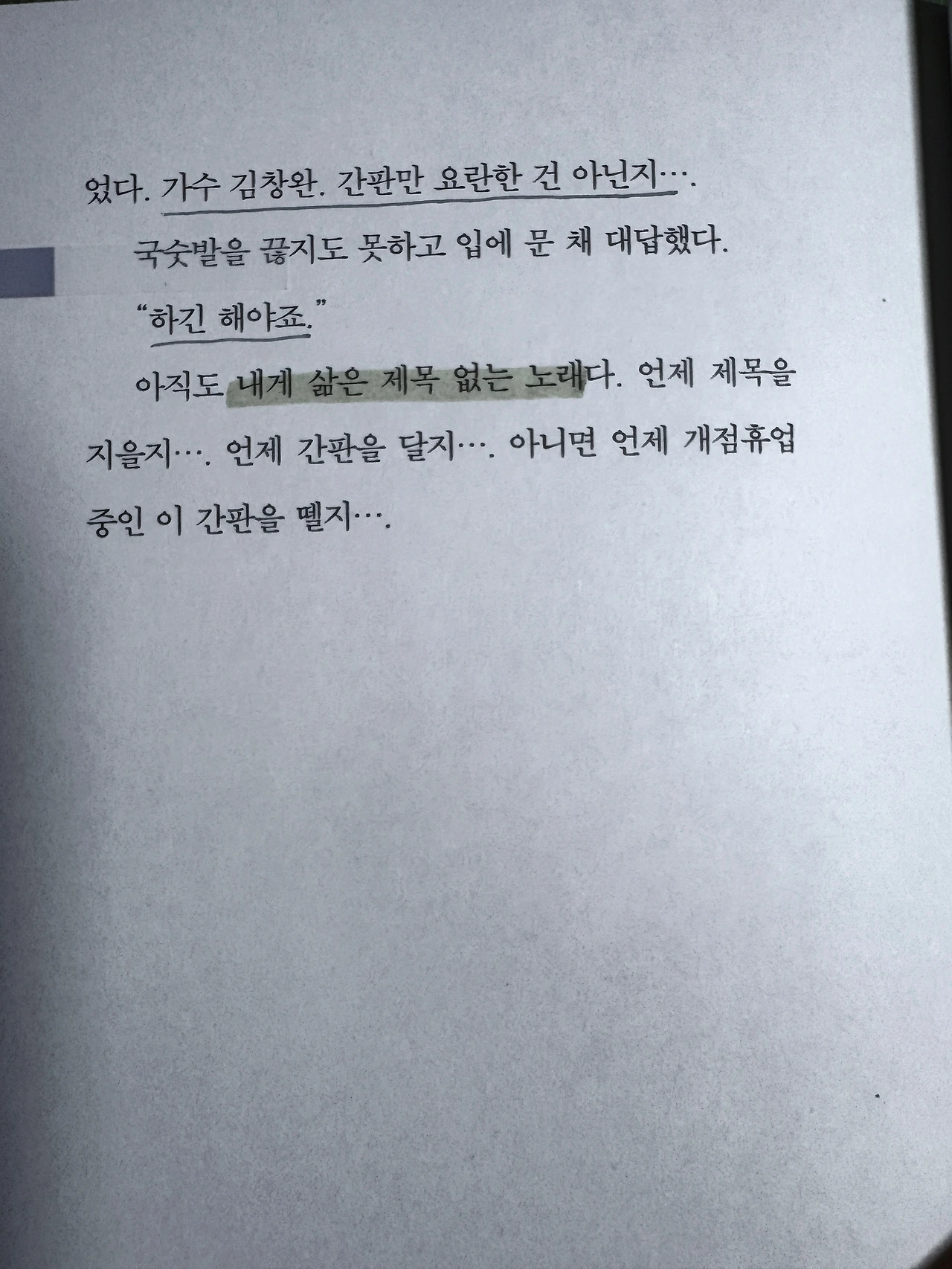 아직도 내 삶은 제목 없는 노래다. 언제 제목을 지을지… 언제 간판을 달지… 아니면 언제 개점휴업 중인 이 간판을 뗄지…. (280면)