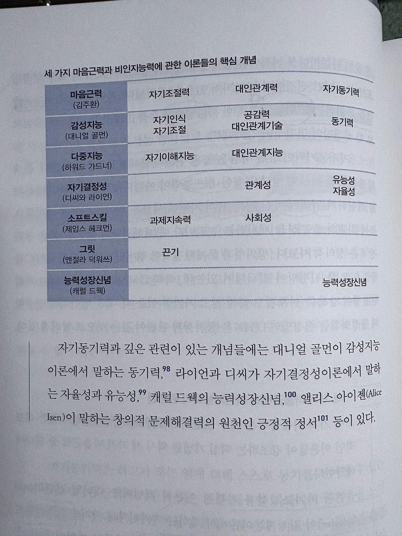 김주환 교수는 세 가지 마음근력과 비인지능력의 관련성을 다른 여러 학자의 주장과 함께 표로 만들어서 정리해 보여준다.