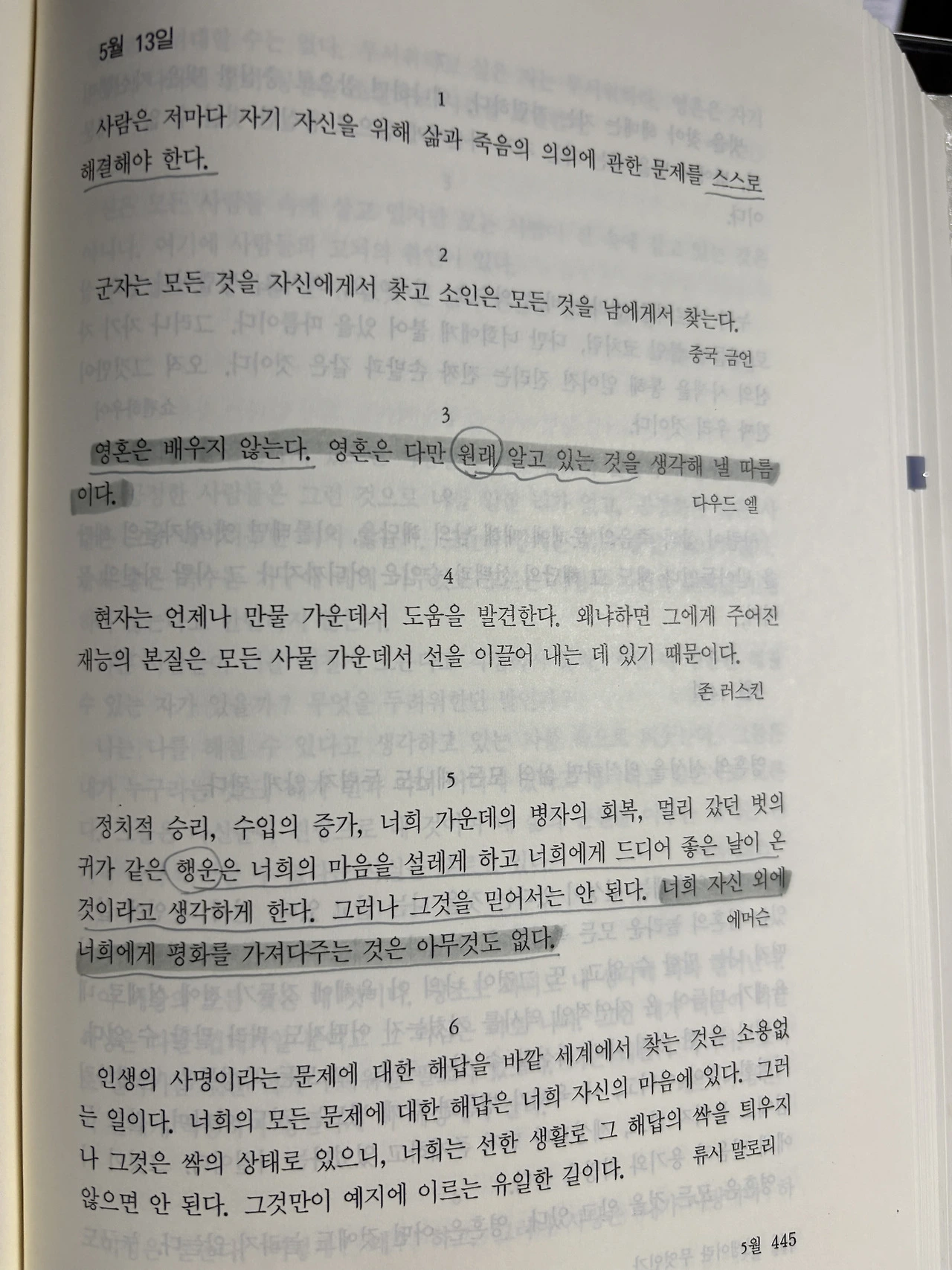 정치적 승리, 수입의 증가, 너희 가운데의 병자의 회복, 멀리 갔던 벗의 귀가 같은 행운은 너희의 마음을 설레게 하고 너희에게 드디어 좋은 날이 온 것이라고 생각하게 한다. 그러나 그것을 믿어서는 안 된다. 너희 자신 외에 너희에게 평화를 가져다주는 것은 아무것도 없다. - 에머슨. (445면)