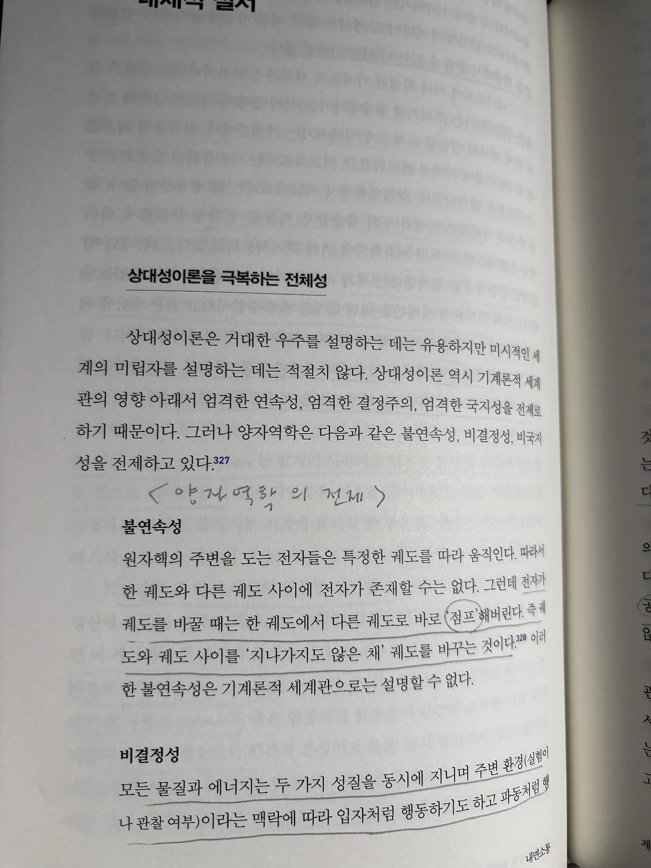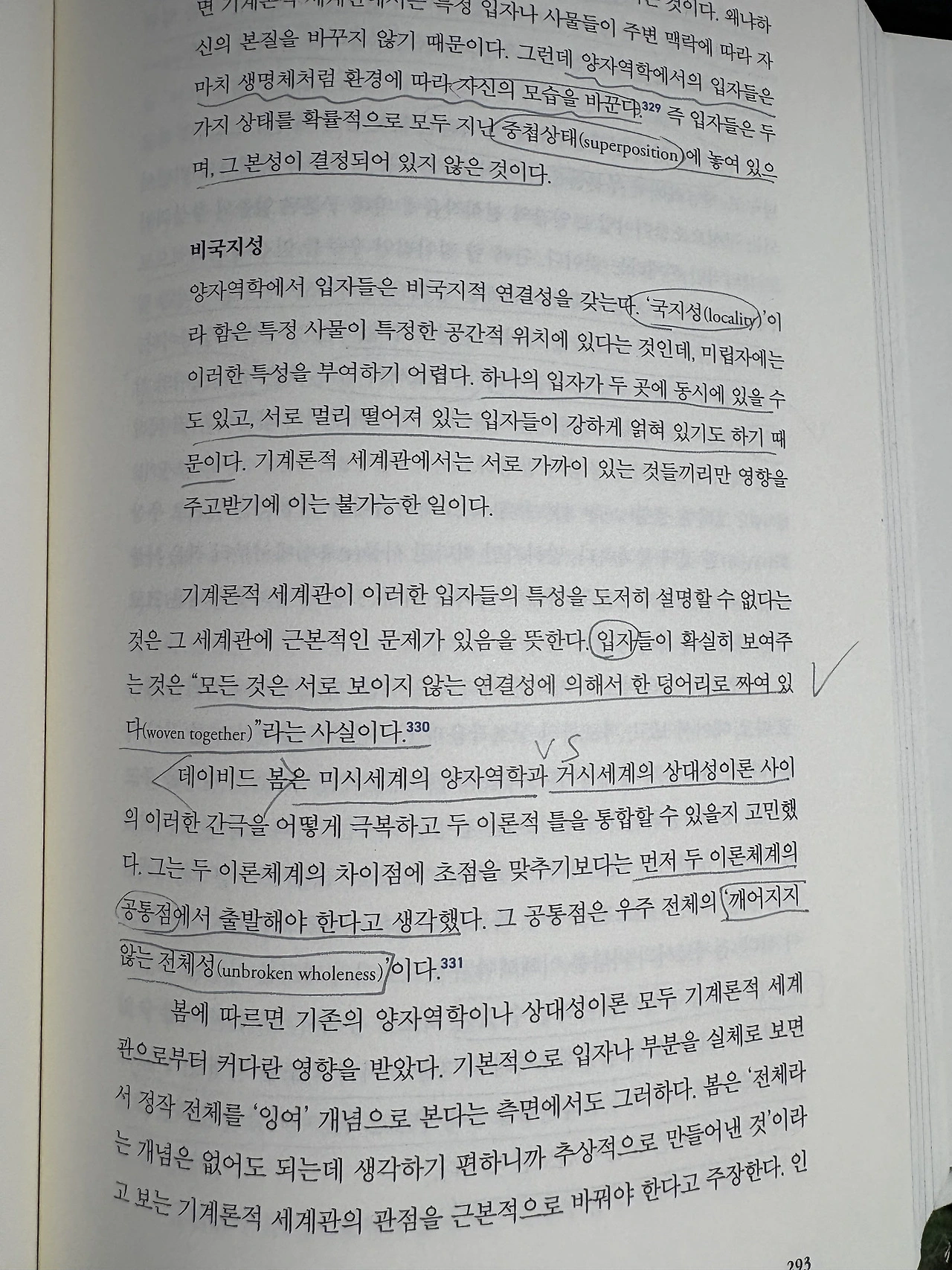 양자역학은 모든 것이 유기적으로 '하나의 전체'를 이룬다는 것을 일관되게 보여준다. 데이비드 봄이 제안하는 우주의 모습은 '하나의 유기적 전체'다. (294면 참고)