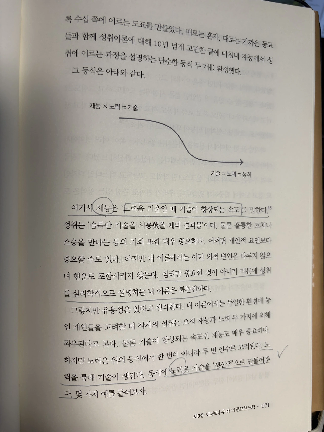 노력은 위의 등식에서 한 번이 아니라 두 번 인수로 고려된다. 노력을 통해 기술이 생긴다. 동시에 노력은 기술을 '생산적'으로 만들어주고(71면 참고) 그것에 노력을 더하면 '성취'가 된다는 이론이다.