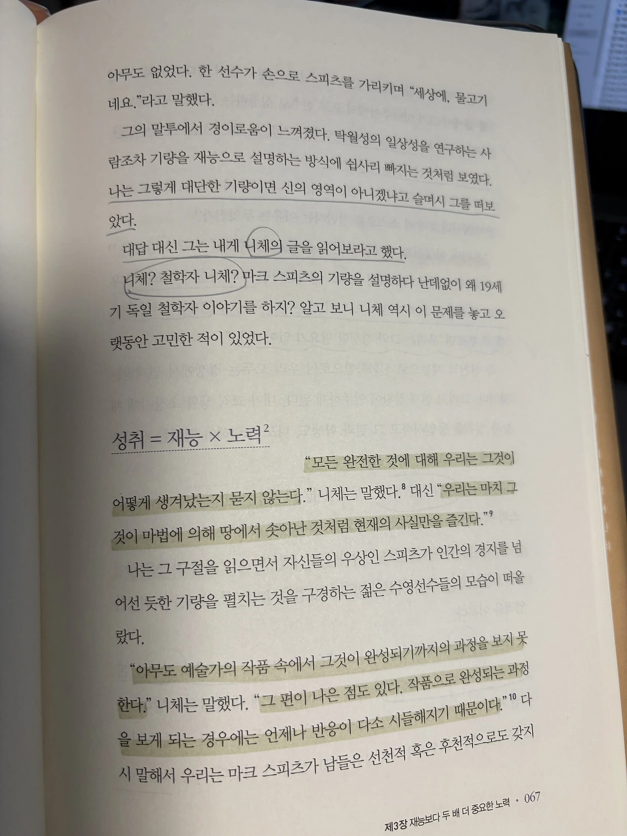 작가는 챔블리스의 조언에 따라 철학자 니체의 글에서 성취와 재능에 대한 부분을 읽는다.