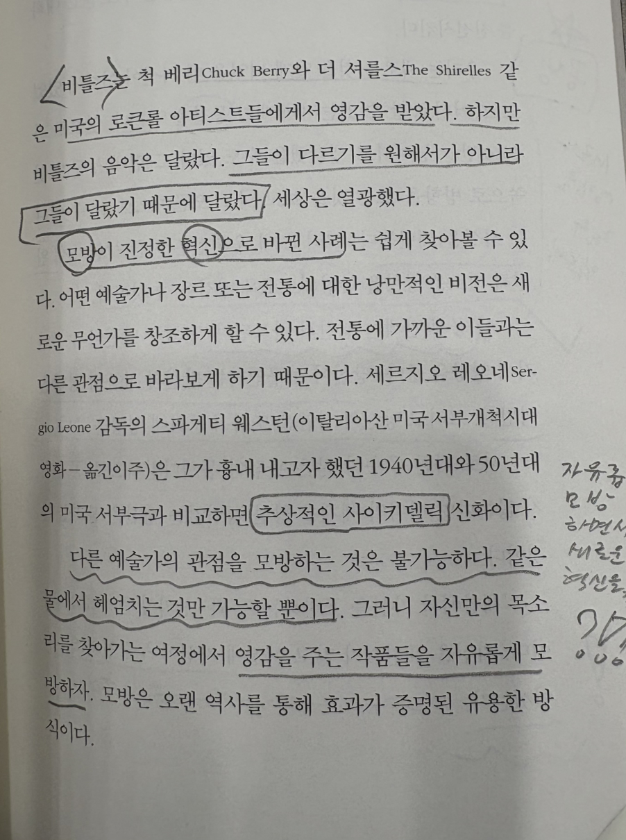 비틀즈도 미국의 로큰롤 아티스트들에게 영감을 받았다. 하지만 그들이 모방이 아닌 새로운 역사를 쓴 것은 그들이 다르기를 원했던 것이 아니라 그들이 달랐기 때문이라고 말한다.
