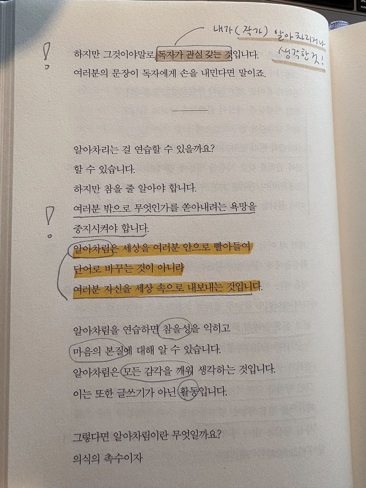 하지만 작가는 그 알아차림의 순간에서 '참을성'있게 다음 알아차릴 것을 기다려야 한다고 말한다.