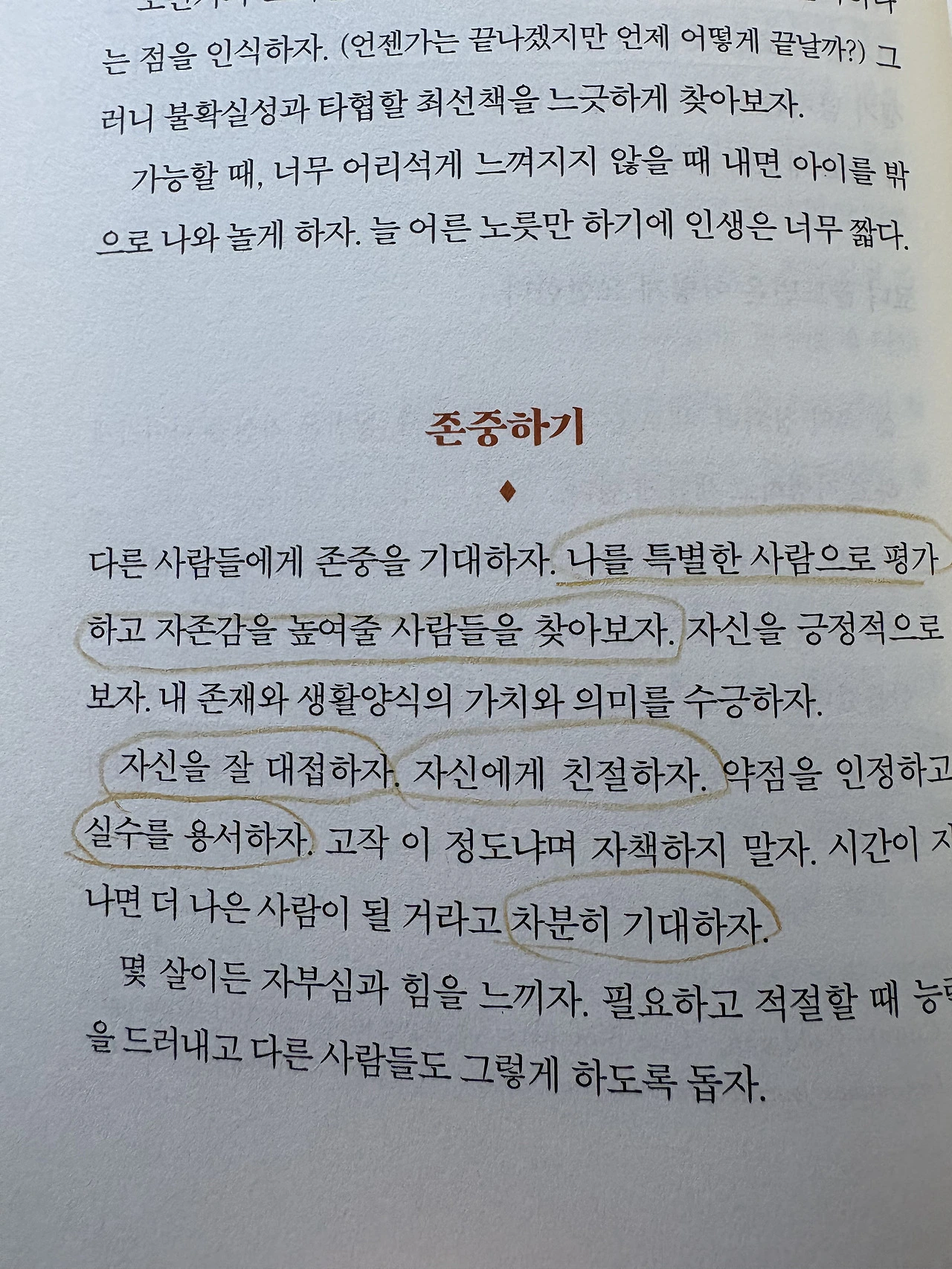 앞으로 어떻게 살아야 할지 여전히 고민 중이라 이 책을 다시 펼쳐서 밑줄 그은 곳을 읽어 본다.