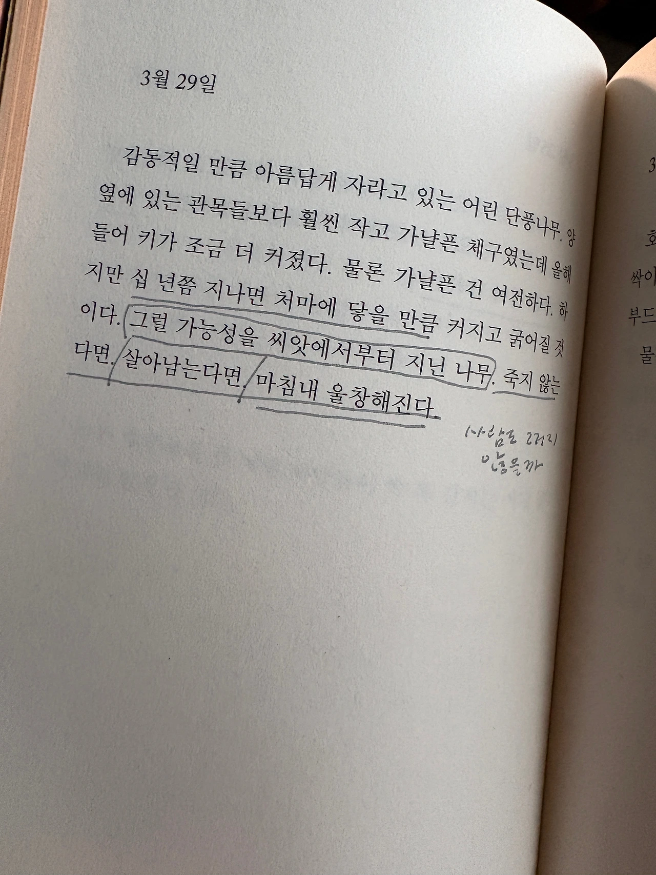 감동적일 만큼 아름답게 자라고 있는 어린 단풍나무. (…) 물론 가냘픈 건 여전하다. 하지만 십 년쯤 지나면 처마에 닿을 만큼 커지고 굵어질 것이다. 그럴 가능성을 씨앗에서부터 지닌 나무. 죽지 않는다면, 살아남는다면, 마침내 울창해진다.