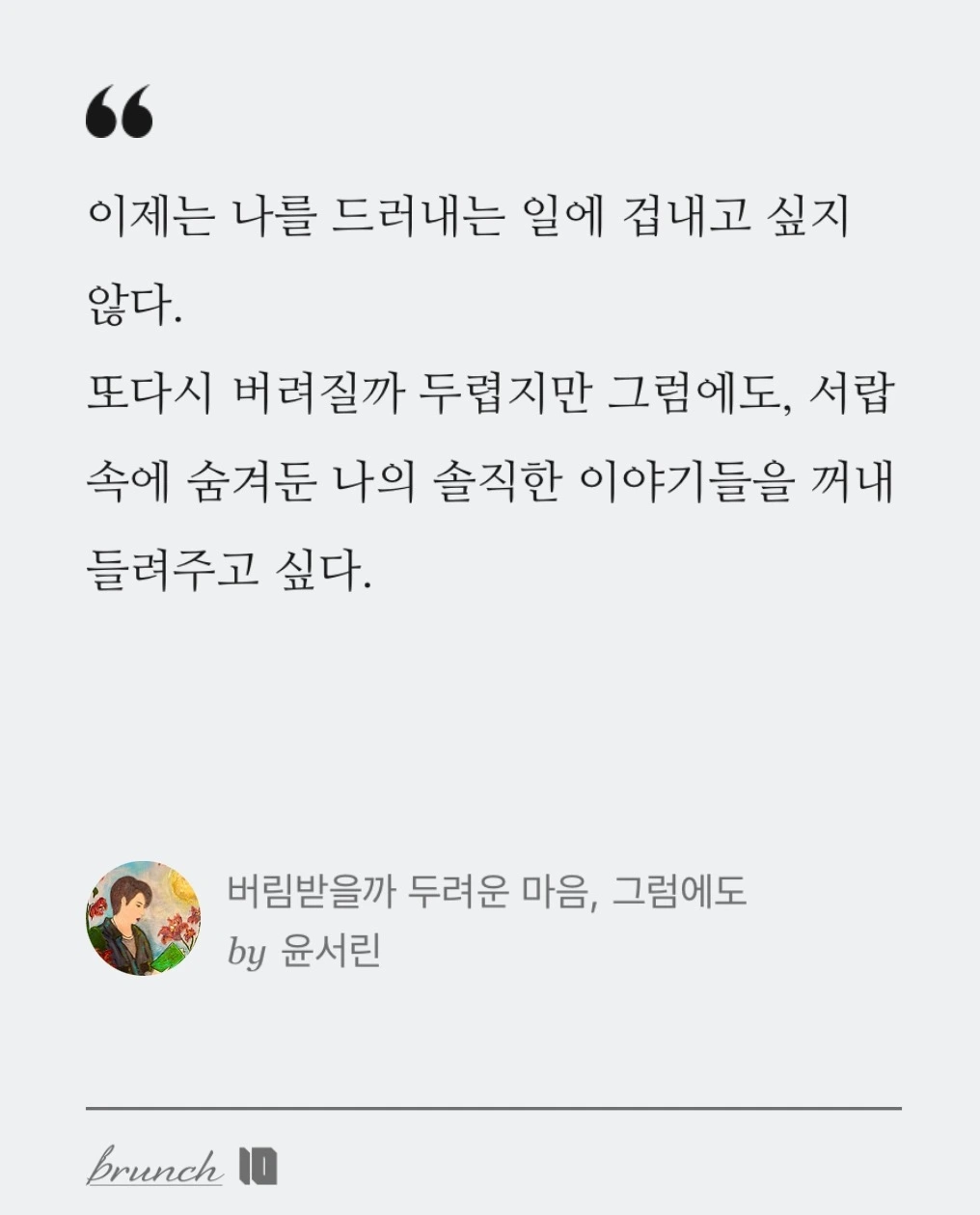 또다시 버려질까 두렵지만 그럼에도, 서랍 속에 숨겨둔 나의 솔직한 이야기들을 꺼내 들려주고 싶다.