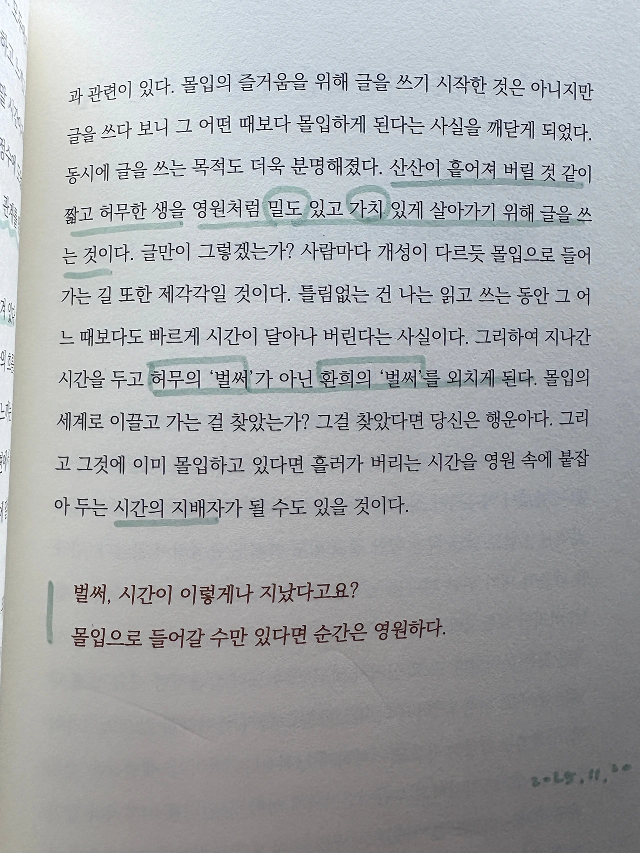 아침마다 읽고 쓰는 몰입의 순간, 고개를 들어보면 어느새, 벌써 시간은 흘러가있다. 소위 작가의 말처럼 “허무의 벌써 가 아닌 환희의 벌써”(139면)를 경험하는 순간이다.