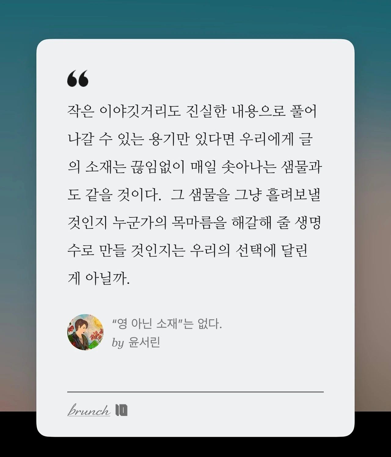 “영 아닌 소재”라고 생각할 수 있는 작은 이야깃거리도 진실한 내용으로 풀어나갈 수 있는 용기만 있다면 우리에게 글의 소재는 끊임없이 매일 솟아나는 샘물과도 같을 것이다. 그 샘물을 그냥 흘려보낼 것인지 누군가의 목마름을 해갈해 줄 생명수로 만들 것인지는 우리의 선택에 달린 게 아닐까.