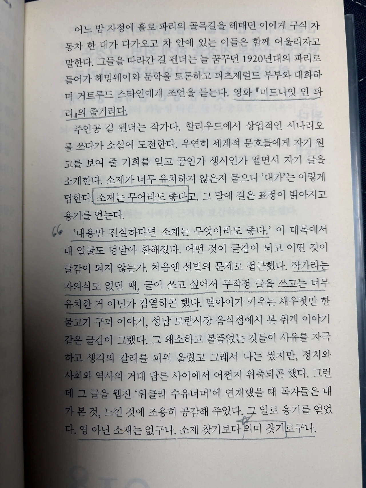 은유 작가는 영화 <미드나잇 인 파리>의 대사를 통해 글쓰기에 대한 고민을 털어낸 이야기를 들려준다.
