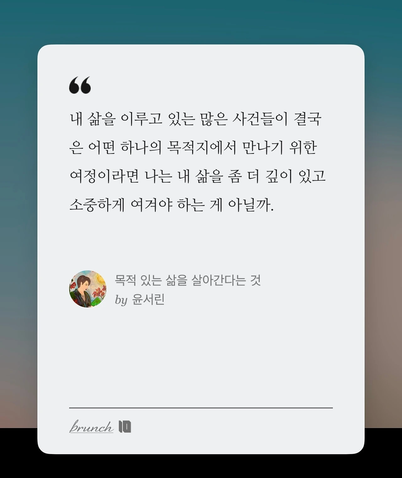 내 삶을 이루고 있는 많은 사건들이 결국은 어떤 하나의 목적지에서 만나기 위한 여정이라면 나는 내 삶을 좀 더 깊이 있고 소중하게 여겨야 하는 게 아닐까.